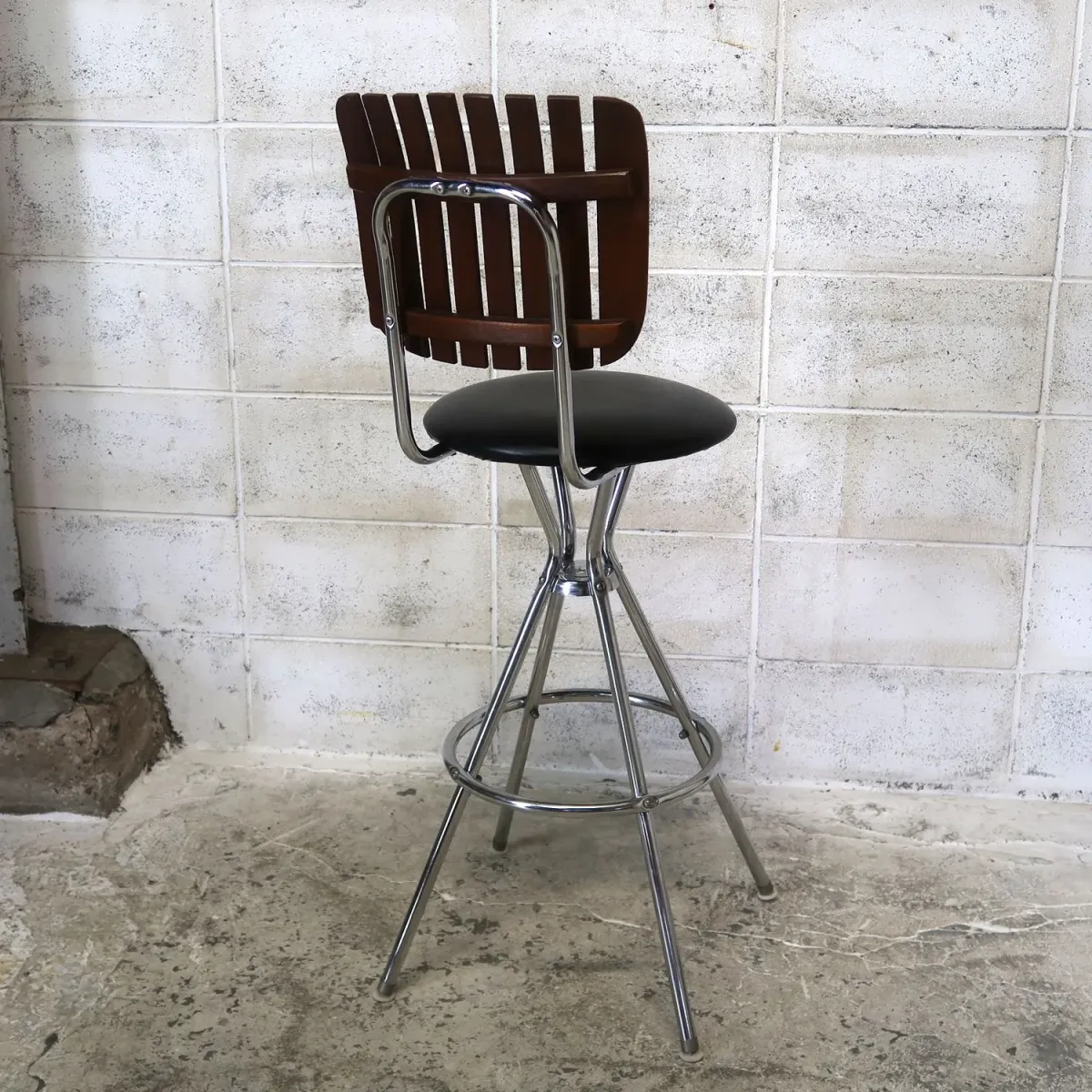 人気の高いウッドとメタルのコンビネーション。スタイリッシュでシェイプの効いたミッドセンチュリーらしい存在感が魅力的。 抜けのある背もたれ、シルバーに輝くクロムメッキ、丸型のビニールレザー、細部まで拘り抜いたそこにあるだけで絵になるスツールです。