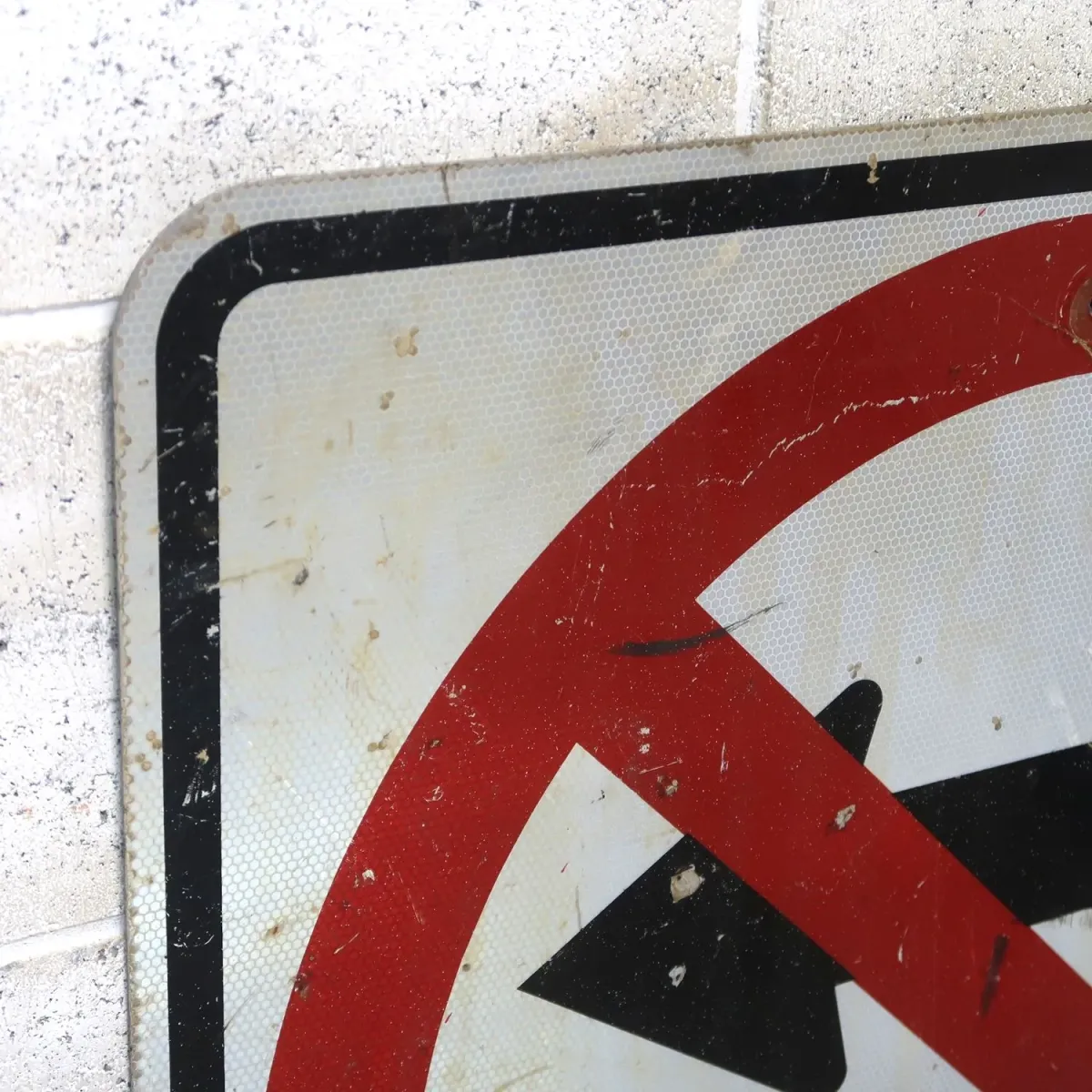 NO LEFT TURN (左折禁止) を表す標識です。 目を引くレッド&ブラックカラー、分かりやすいシンプルデザインと、アメリカのロードサイドで実際に使われてきたキズや汚れ、世界に一つしかない空気感が魅力的。 表面は反射仕様で、ライトが当たるとキラッと光ってくれますよ。