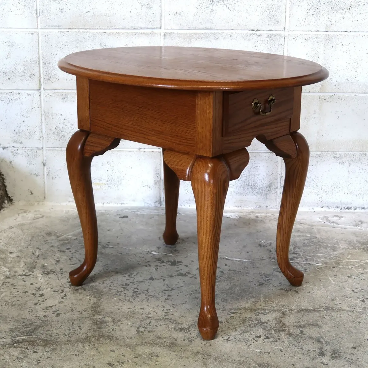 特徴的なオーバル天板に猫脚、味のある温かい木目、各所の装飾に拘りが感じられます。OLDなフォルムのハンドルも良い雰囲気です。 引き出し収納部の容量もしっかりとあり、実用的なのも嬉しいポイントですね。角の丸いフォルムで圧迫感もさほど感じません。