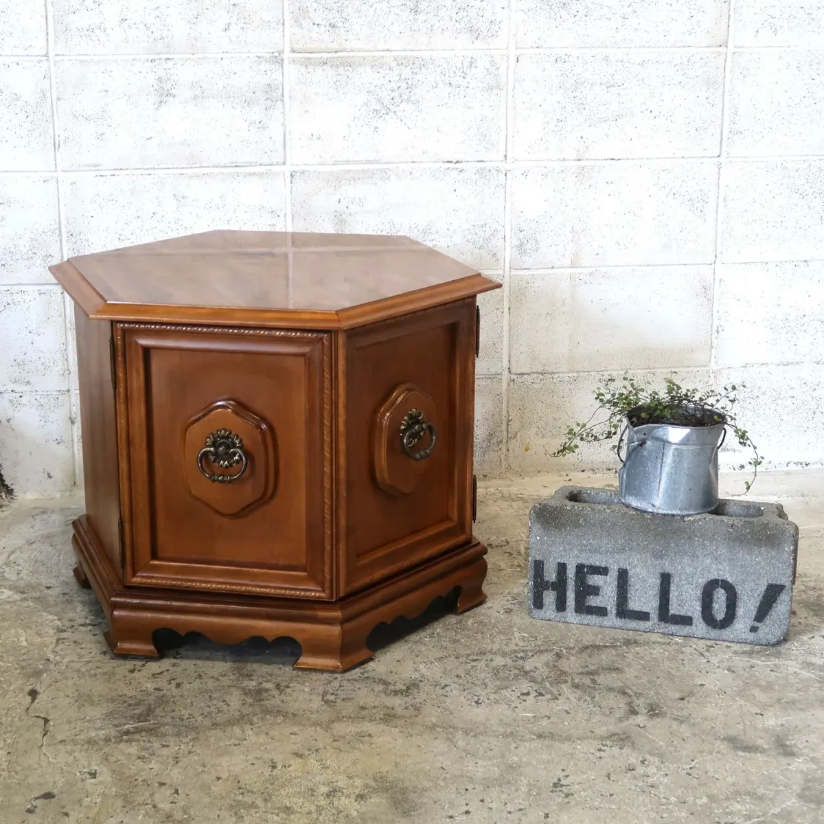 クラシックな雰囲気漂うヘキサゴン(六角形)デザインが特徴的で目を引きます。拘りを感じる天板や縁、OLDな扉の装飾金具ハンドルが良いアクセントになっています。 歴史を感じる雰囲気と重厚な存在感、アンティークならではの味のある世界観にグッと惹かれます。