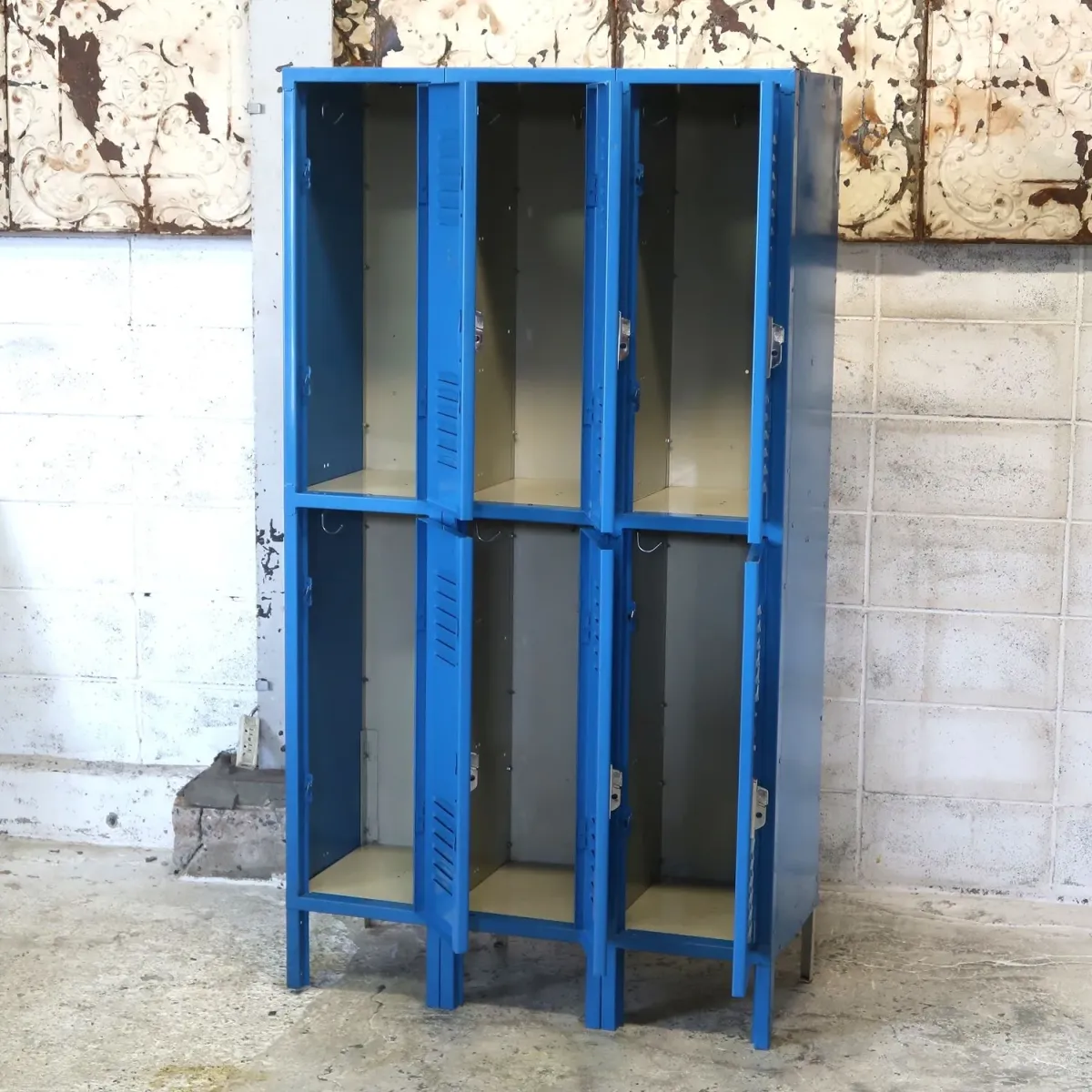 ロッカーも様々な種類がありますが、こちらはお探しの方も多い人気のタイプ。小さな扉が分別に便利で使い勝手の良い6連ロッカーです。 鮮やかなブルーカラーが目を引くメタルボディ、無骨で重厚なインダストリアルデザインが存在感抜群。脚があるタイプなので抜け感があるのも良いですね。 各扉のハンドルのデザインもCOOL、どっしりとした佇まいは貫禄のオーラを放っています。