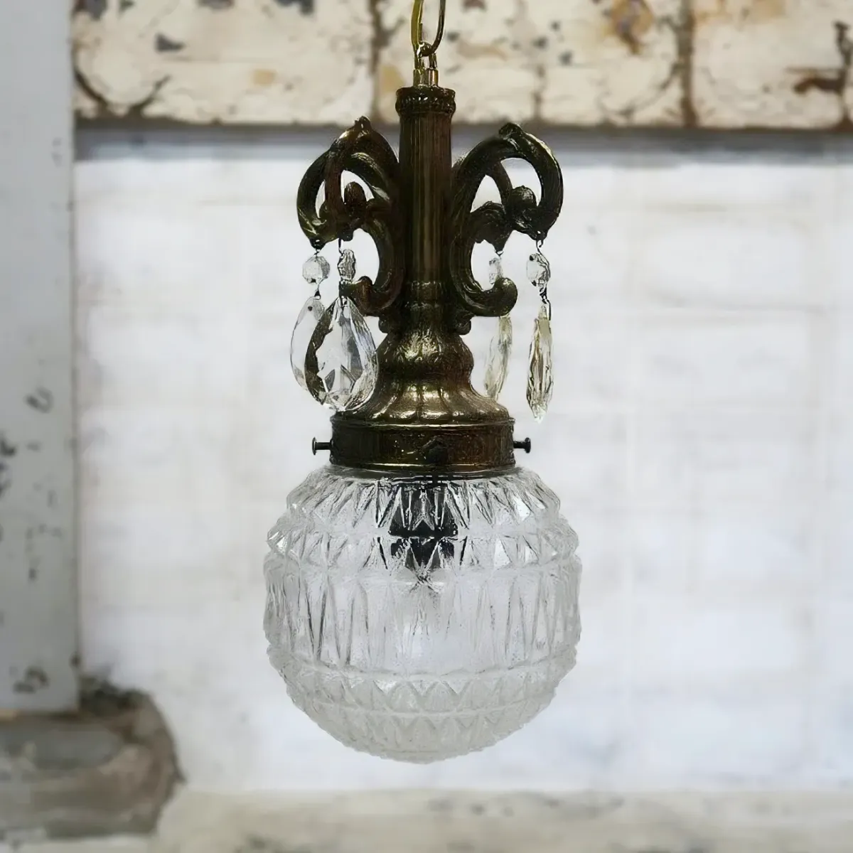 人気の真ん丸フォルムの高級感ある分厚いクリアガラスランプ、全面に施された大き目の凸凹パターンのカット模様が目を引きますね。 希少なクリスタル飾り付きのOLDな装飾金具もガラスと合っていて良い雰囲気です。全体的なバランスもGOOD。デザイン性も高く、昼間も飾っているだけで絵になります。