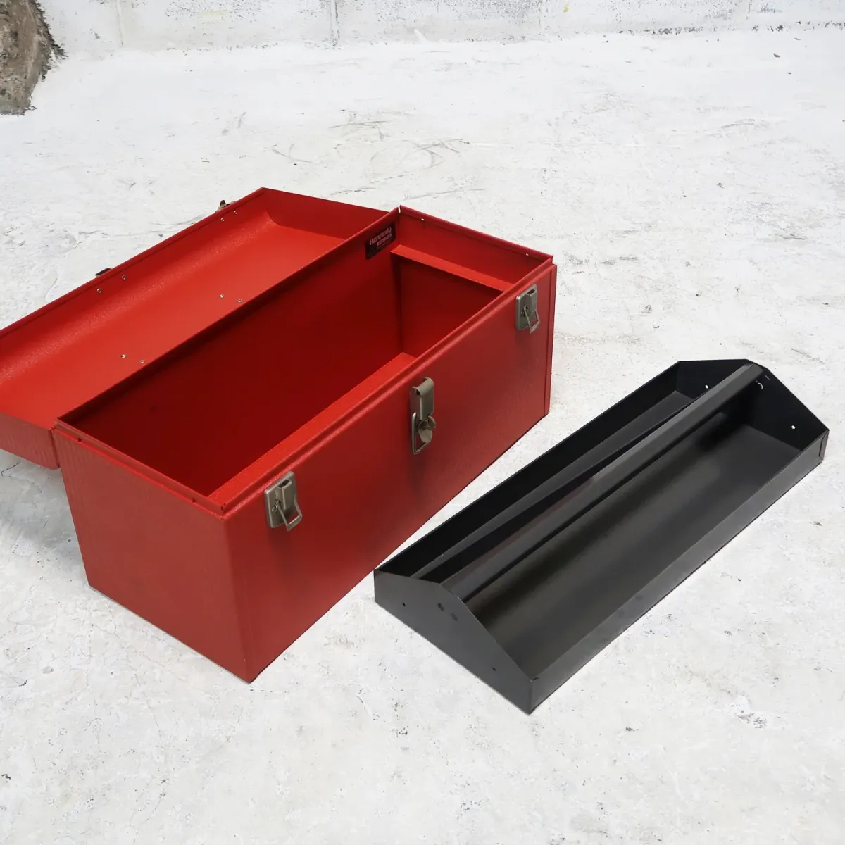 内部は取り外し式のトレイ付きで2段構造になっているので、効率良く収納できるでしょう。 レッドとグレーカラーとのコントラストが効いていますね。 工具や釣り道具、小物入れとしてはもちろんですが、ガーデニング用品を入れたりガレージやSHOPの実用を兼ねたディスプレイにも良い雰囲気を創ってくれそうです。