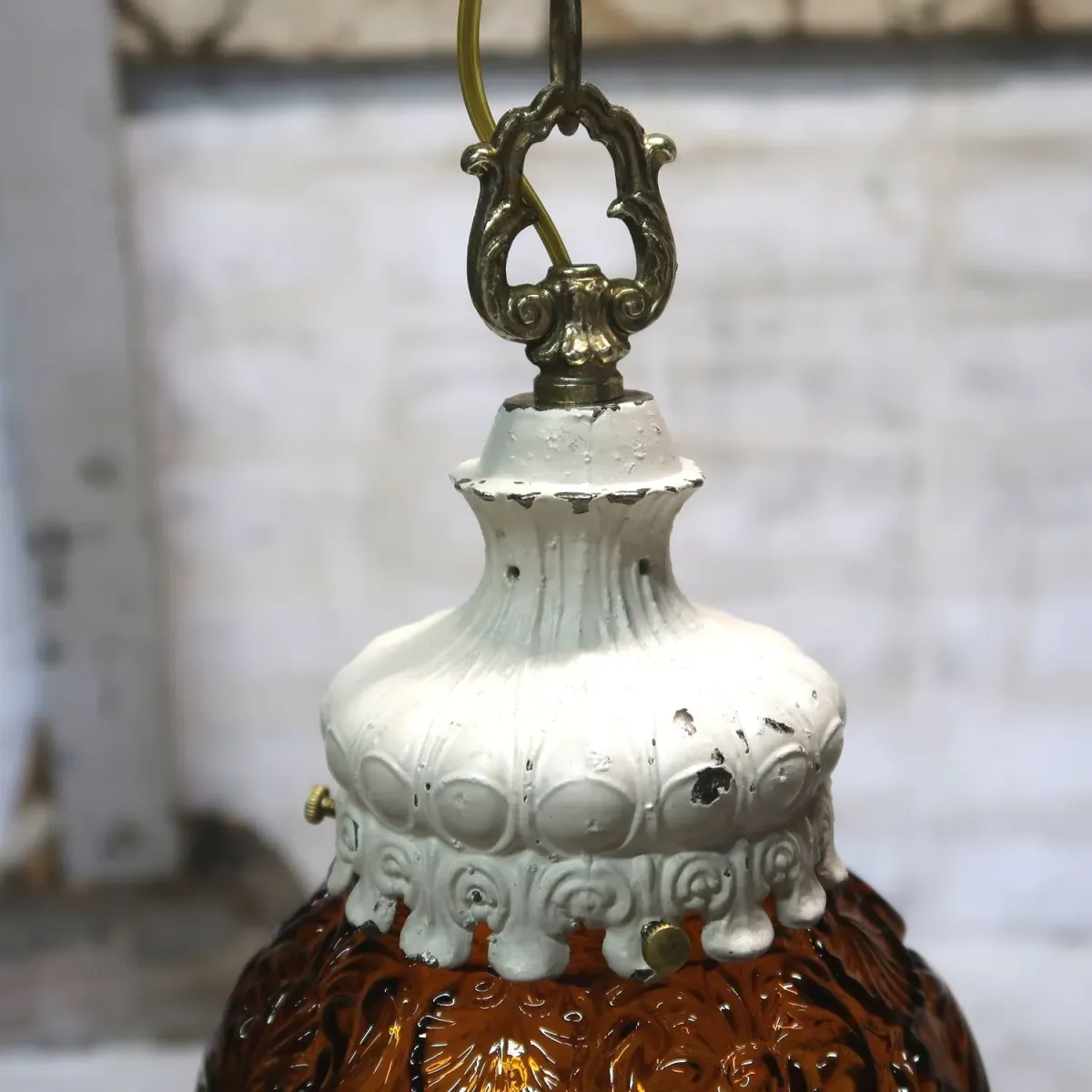 真ん丸フォルムのアンバーガラス、表面に入った緻密な凹凸デザインが目を引きます。ホワイトペイントのOLDな装飾金具もGOOD。ガラスの雰囲気にマッチしていて良いですね。