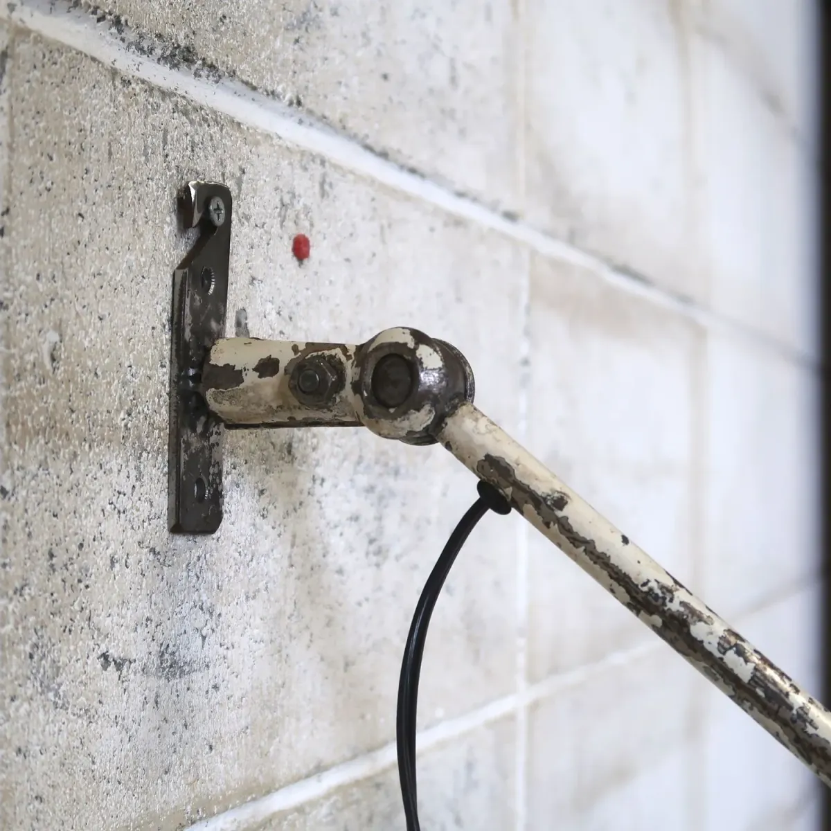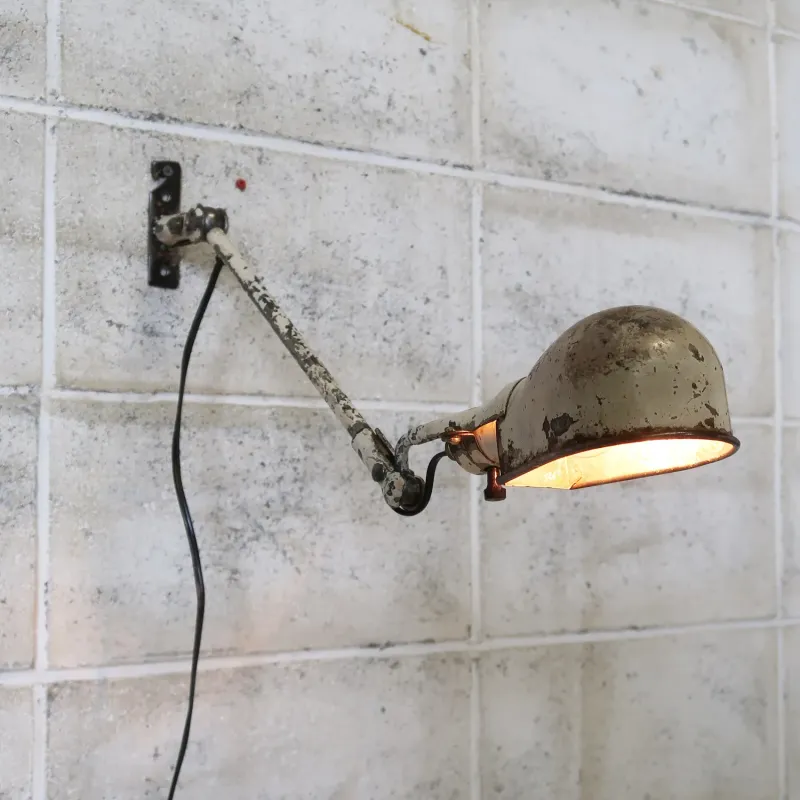 長い年月を経て良い感じにヤレた重厚なメタルのリアルな空気感がカッコ良く印象的。インダストリアルらしい無骨なカラーリング、機能美を感じる無駄の無い作りに惹かれます。 ベースはビス等で壁やデスク天板に固定するタイプ、フック部分で簡単に引っ掛けることもできます。 関節が2ヵ所あるので自由に角度や位置を調整できます。多関節のランプは独特のCOOLな世界観があり、目を引きますね。