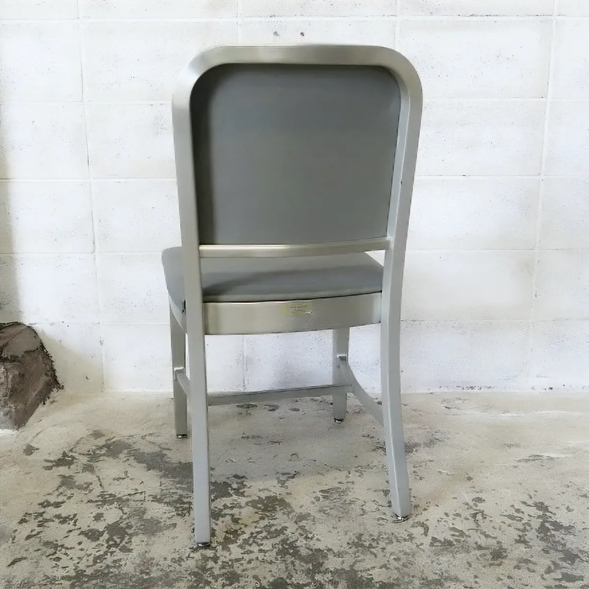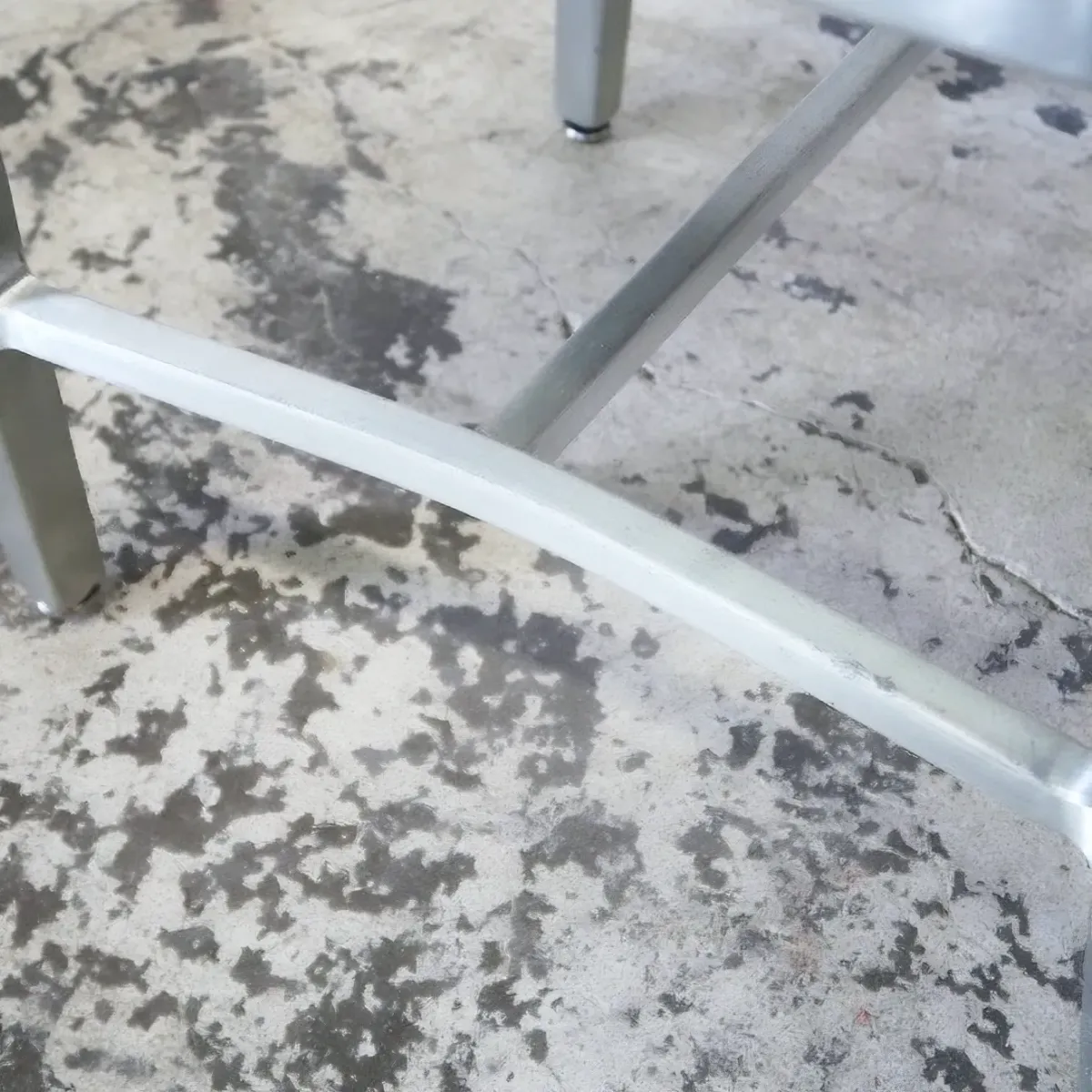 無骨な雰囲気の角ばったアルミ材に、曲線が共存したGOODデザイン。背もたれや座面のビニールレザーも高級感のあるパンチング仕様で目を引きますね。当時のプロダクツにしかない存在感があり、とても魅力的です。
