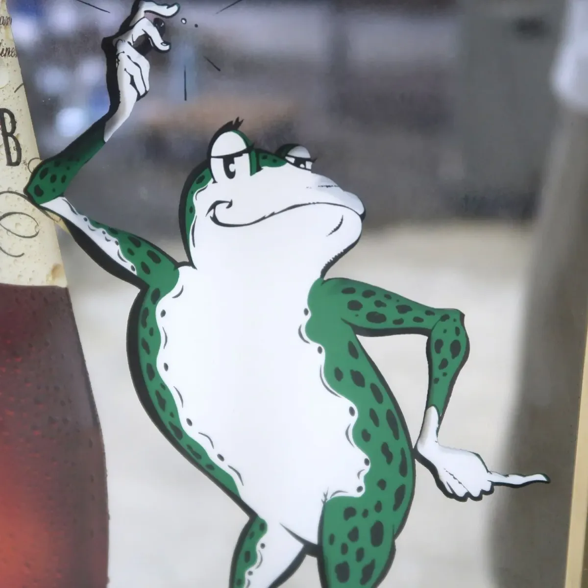 キラリと輝くゴールドフレームにOLDなロゴやボトルのピクチャープリント、なにより可愛らしいカエルのキャラクターが目を引くインパクト抜群のデザイン。