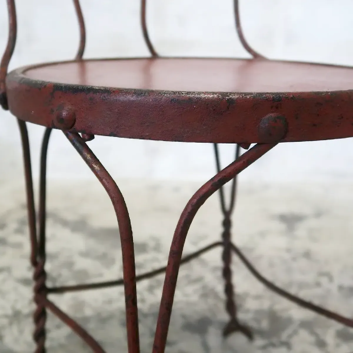 当時のアイスクリームパーラーでよく使われていたデザインのチェアです。 経年によるアイアンのサビや剥がれたレッドペイント、時を経た本物にしか出せないシャビーな風合いが絶妙で雰囲気抜群。 ワイヤーデザインならではの背もたれや脚周りの曲げ・ツイスト装飾、丸いウッド座面も可愛らしく、そこにあるだけで絵になりますね。