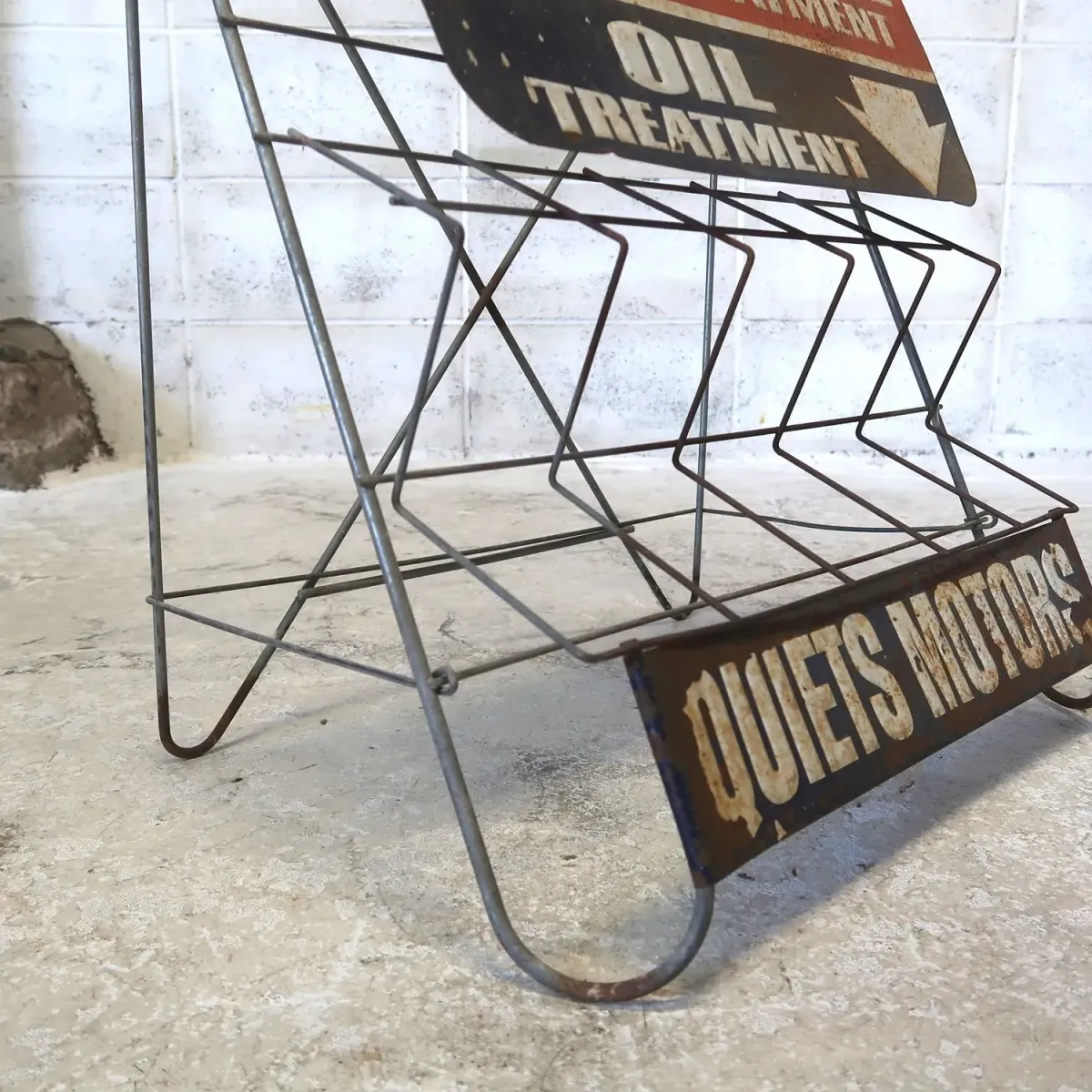 当時はAUTO SHOP等でガソリン・オイル用トリートメントのディスプレイに使用されていた物です。 年代を感じるワイヤーメタルの無骨な作り、サインプレートのOLDなエンボスのレタリングやトリコロールのカラーリングが良い雰囲気。経年の風合い、ストア系の空気感タップリでカッコ良いですね。