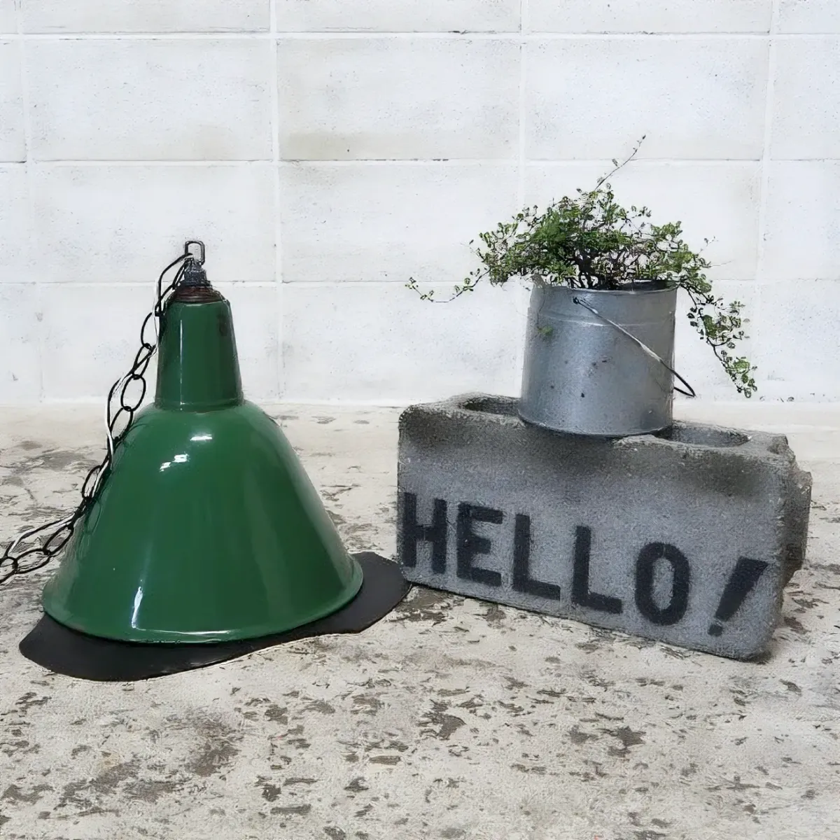 UFO型のホーローランプは見かけますが、こちらは珍しいブレッド型フォルムデザイン。落ち着いたグリーンの重厚なホーローが印象的で目を引きます。各所の金具パーツも無骨なカッコ良さがあります。