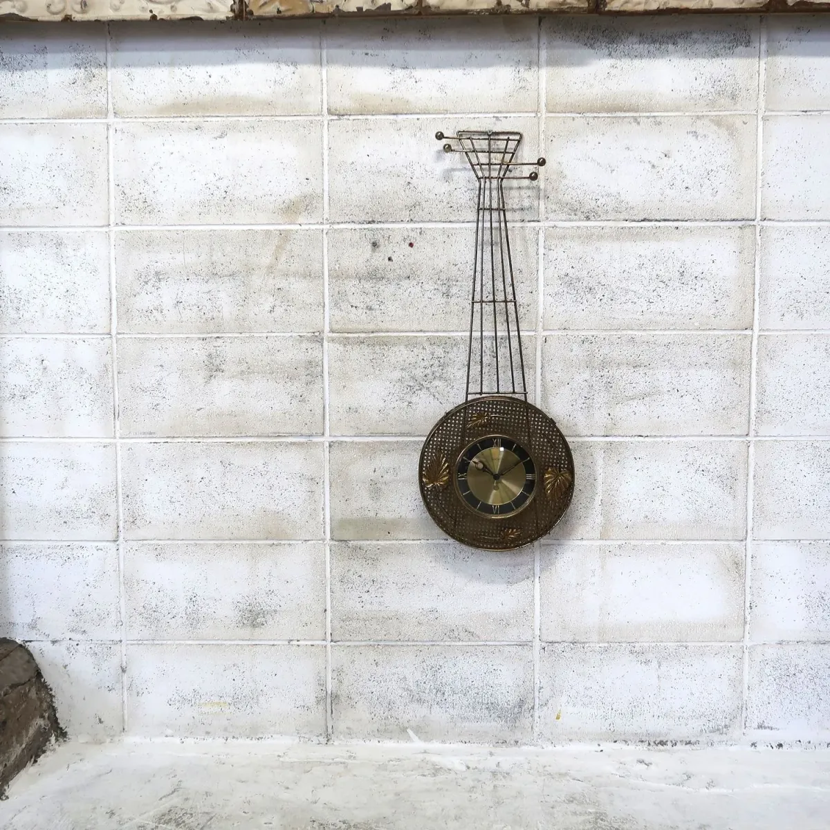 アメリカンミッドセンチュリーモダンを代表する人気のウォールデコクロック。 こちらは現地でも希少で人気の楽器モチーフデザイン、ブラックとゴールドのコントラストがCOOLで落ち着いた雰囲気。 ワイヤーのネック部やメッシュのボディ、拘りのメタルワークで存在感は光るモノがあります。 文字盤のCOOLなデザインやガラス風防も良いですね。
