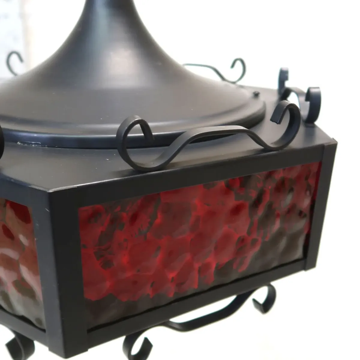 希少且つ明るさもしっかり確保できる3灯式。当時らしいブラックアイアンボディにレッドのステンドガラスと下部ドーム型のガラス、ミッドセンチュリーモダン特有の独特な印象を感じさせてくれます。