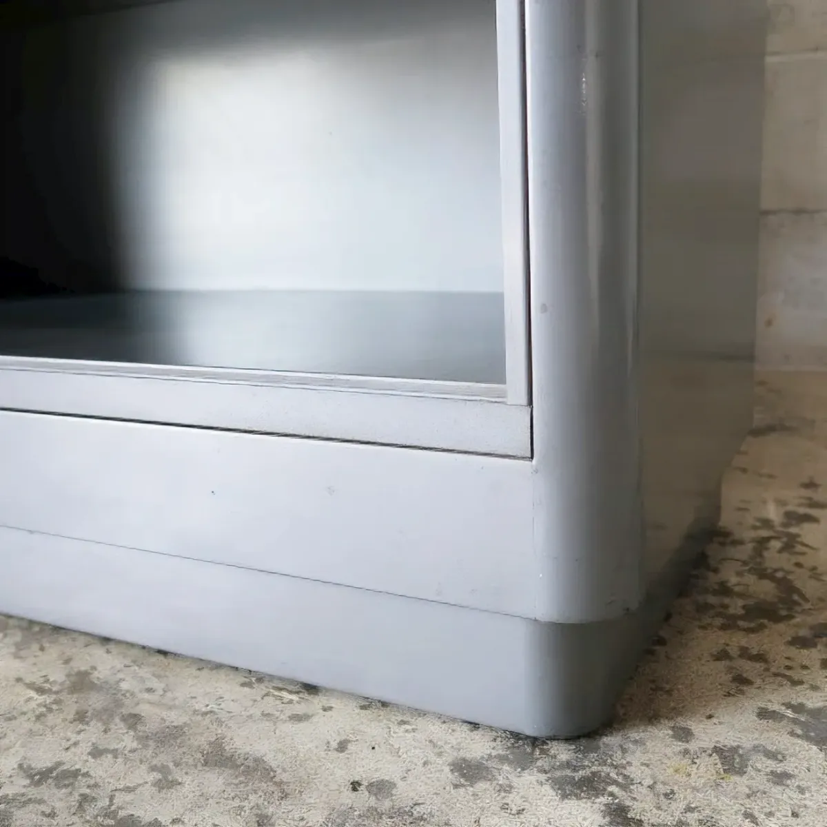 無骨で重厚、存在感のあるインダストリアルデザイン、何より雰囲気が良いですね。クリアガラスのガラス戸、探すと意外と見つからないスライドドアタイプです。前面上部のロゴタグもカッコ良いですね。 空間創りの一つのインテリアとして、そこにあるだけで絵になるスペシャルビンテージアイテムです。