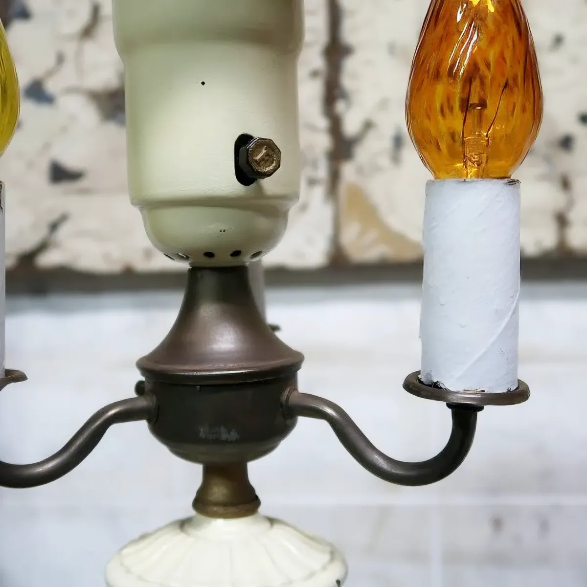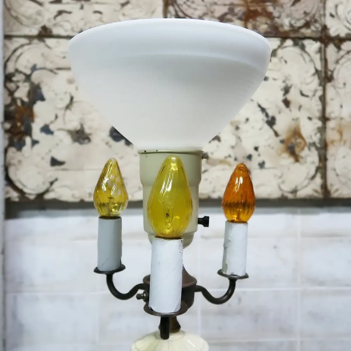 希少な4灯式、キャンドルランプとミルクガラスのシェードとの組み合わせが珍しく目を引きます。鈍く輝くゴールド×ミルクペイントメタル、キャンドルアームやベースデザインが当時らしいOLDでゴージャスな良い雰囲気。