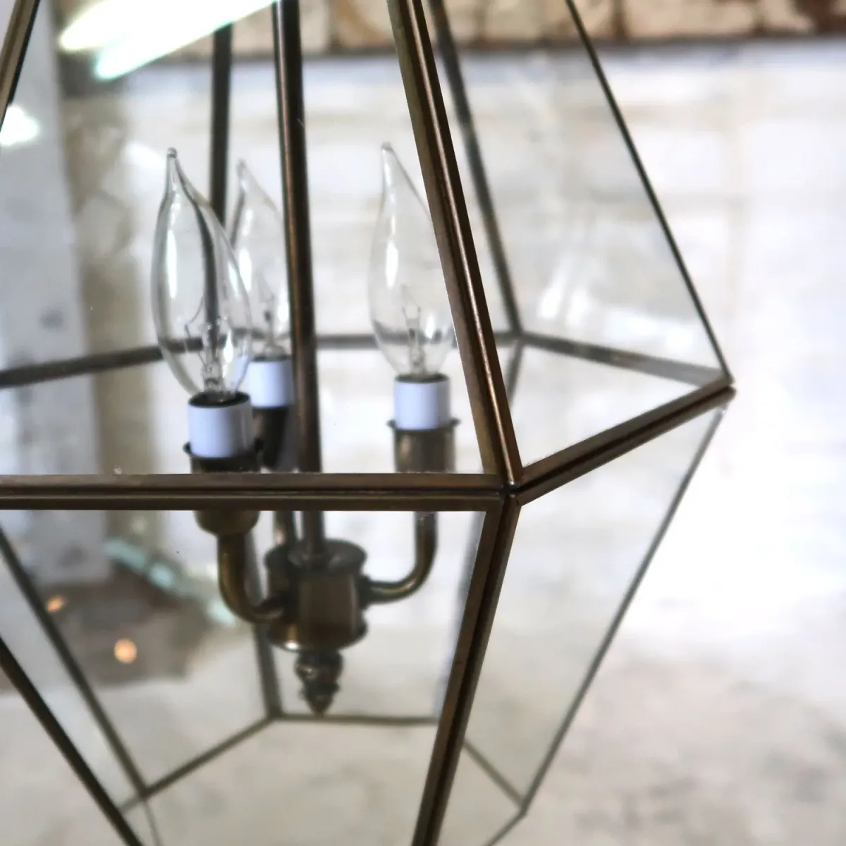 クリアのステンドグラスシェードの中に3本のキャンドル型ランプが吊られています。 ステンドタイプは色付きのモノが多いですが、クリアガラスもまた違った独特の雰囲気があって魅力的ですね。