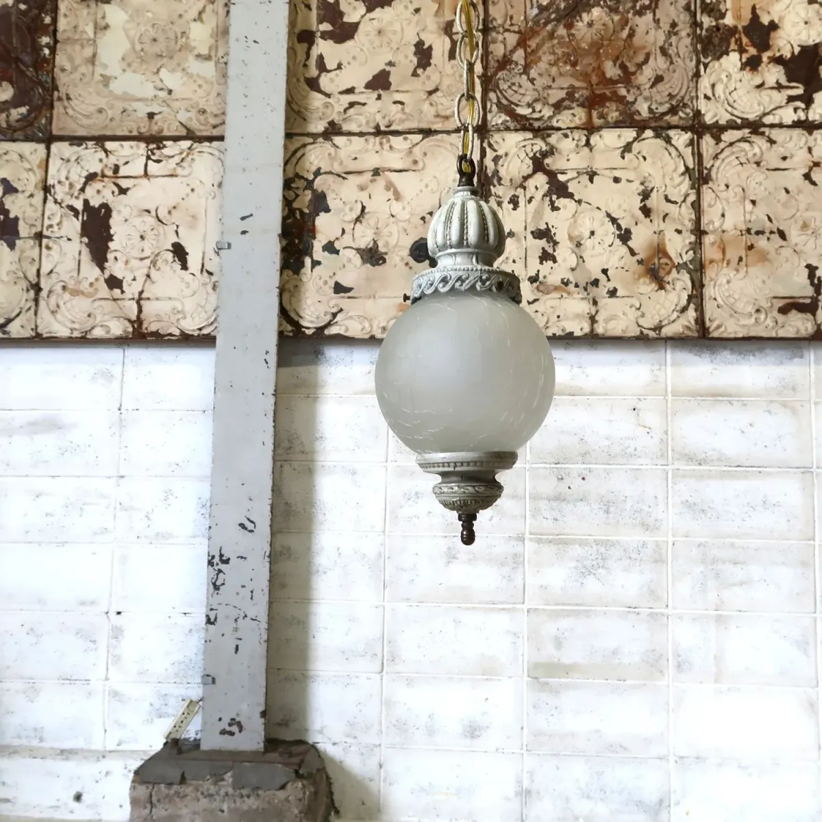 人気の高い真ん丸フォルム、フロストガラスの表面に入った当時らしいクラック (ひび割れ)模様がとても綺麗で目を引きます。シャビーなホワイトペイントの装飾金具もガラスと合っていて良い雰囲気ですね。 今の物には無いOLDな存在感、昼間も一つのインテリアとして楽しめるデザインと存在感です。