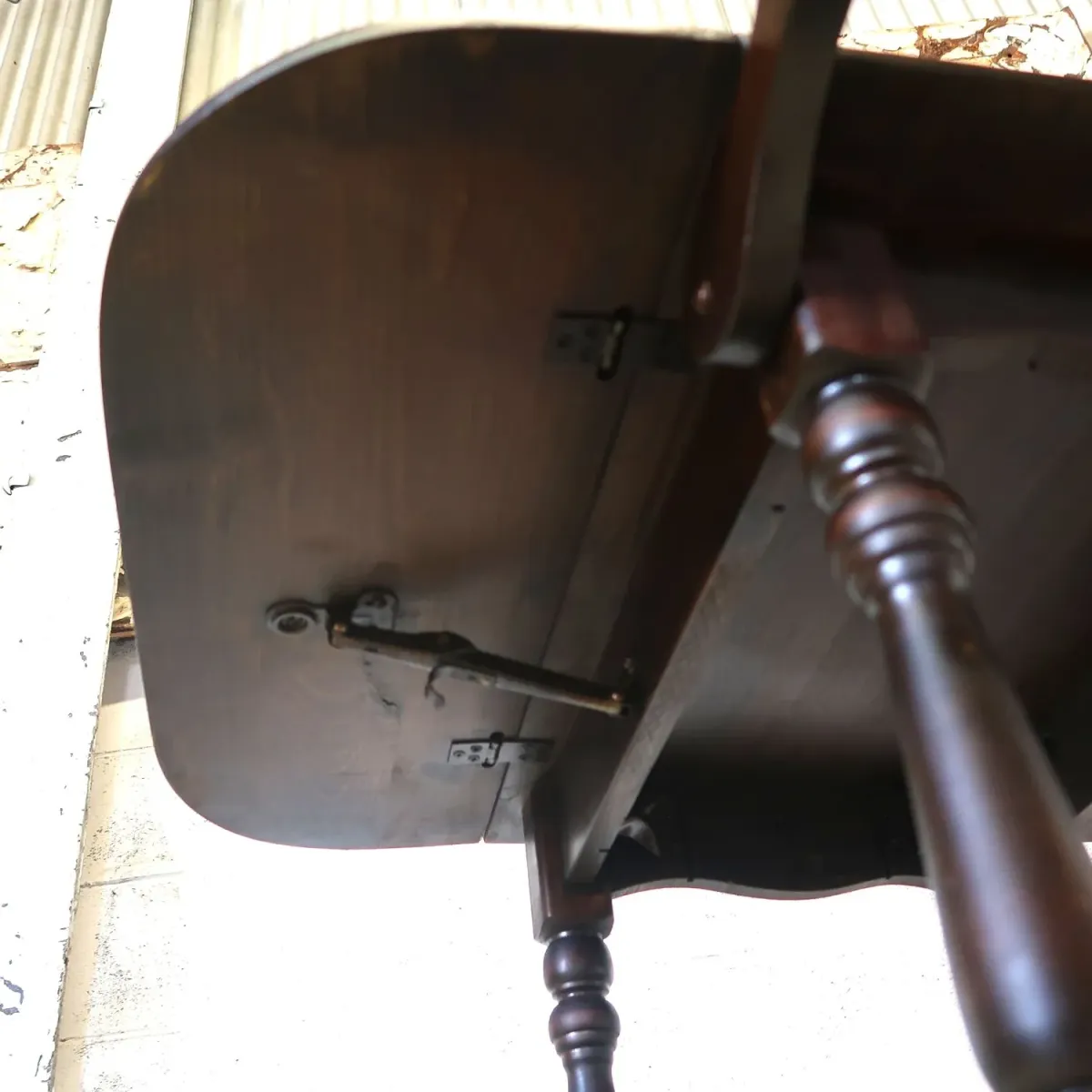 クラシックな雰囲気漂うワゴンデザインが特徴的で目を引きますね。美しいダークな木目、拘りを感じる装飾ポールや車輪周りの重厚感に惹かれます。 天板がバタフライ仕様になっており、もちろん片方のみでも広げられます。両側を閉じた際の天板幅は440mm程です。 歴史を感じる雰囲気と存在感、アンティークならではの味のある世界観が魅力的です。