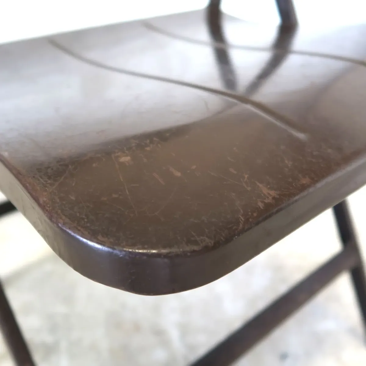 フルメタルのシンプルな折り畳みイス、日本の物とは違ったアメリカンスタンダードなデザインがNICE。 シートは柔らかな曲線で構成され、座り心地もGOOD。座面裏に入ったステンシルもリアルな存在感を放っています。教会で使われていたようですね。 経年からくるリアルなヤレた風合いも魅力的です。