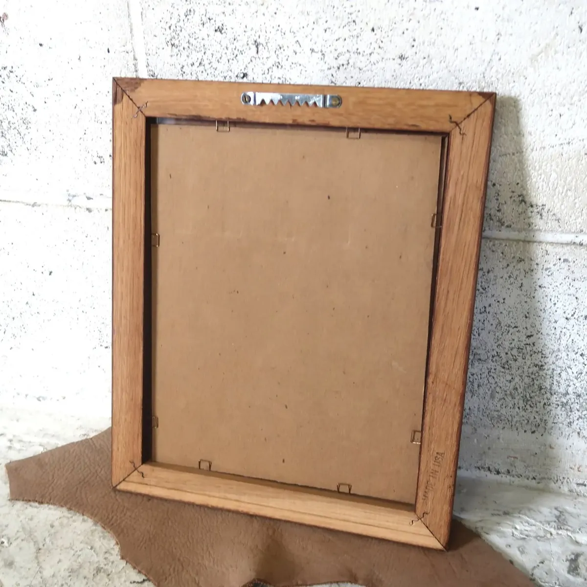 フレームの開口サイズは195×245mm程。 背面に壁掛け用の金具が付いています。金具を付け替えて横で使うのも良いですね。