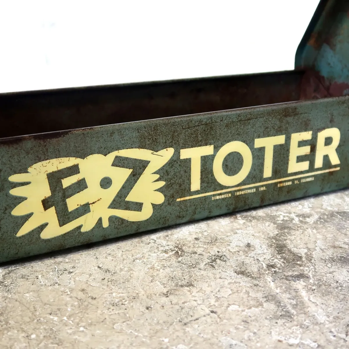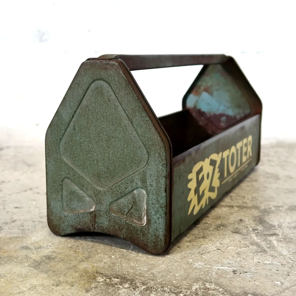 雰囲気ある渋いグリーンカラー、可愛らしさを感じるロゴやエンボスデザインが目を惹きますね。 長年使い込まれてきたキズやサビ、時を経た物にしか創り出せない味のある風合いがカッコ良く存在感がありますね。 軽量ながら、エッジの効いたスクエアデザインの重厚感のある作りが魅力的。