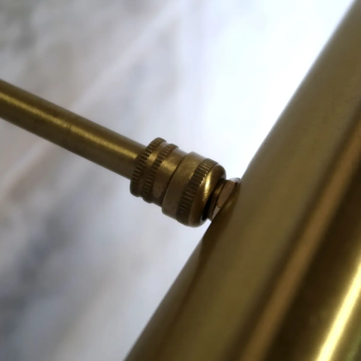 シェード付け根の関節で照らす角度を調節可能。アームは4.5cm程伸び縮みし、前後位置も調節できます。 ベースにビス留め用の穴が複数開いています。