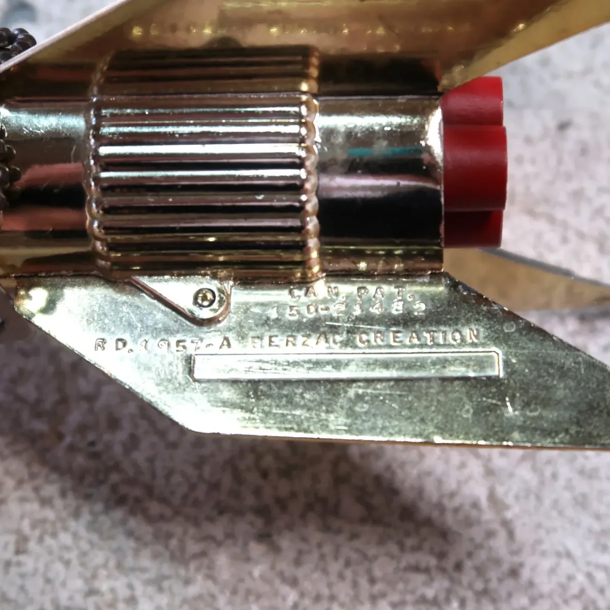 メタルでリアルに再現されたゴールドボディのロケット、なかなか見かけないレアなデザインです。 ミッドセンチュリー家具とも相性良くオブジェになりますね。各所のレッドカラーが良いアクセントになっています。 矢印のレバーを下に引き、ボタンを押して弾くと硬貨が穴に入る仕組みになっています。
