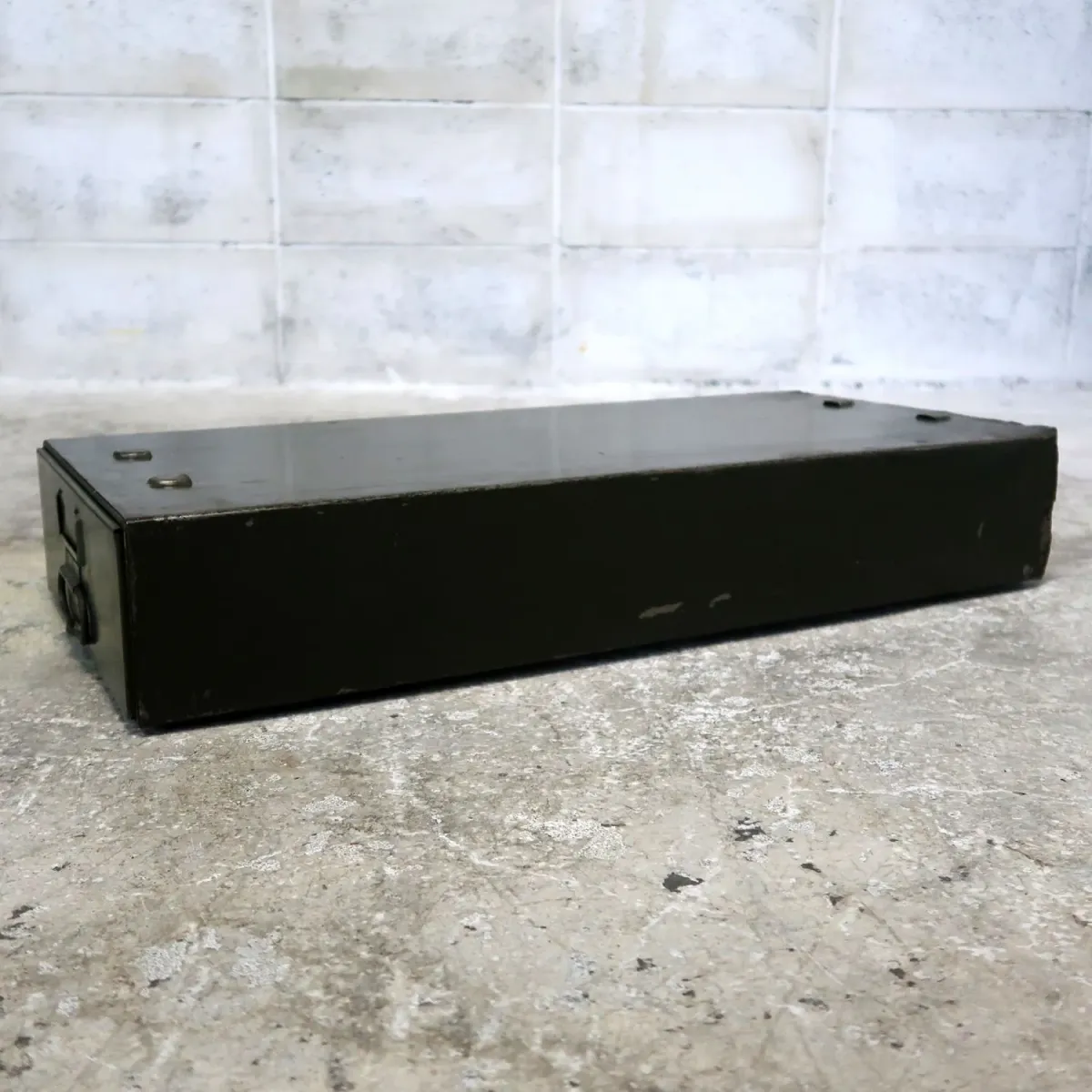 エッジの効いたスクエアデザイン、軍モノのような深いグリーンカラーが最高にカッコ良いですね。適度にヤレた表情のメタルボディやフロントのエンボスロゴも魅力的です。 奥行きがしっかりあり、収納力抜群。同シリーズのキャビネットであればスタッキングできる仕様になっています。 ハンドル部にカードホルダーが付いているのも実用的で嬉しいポイントですね。