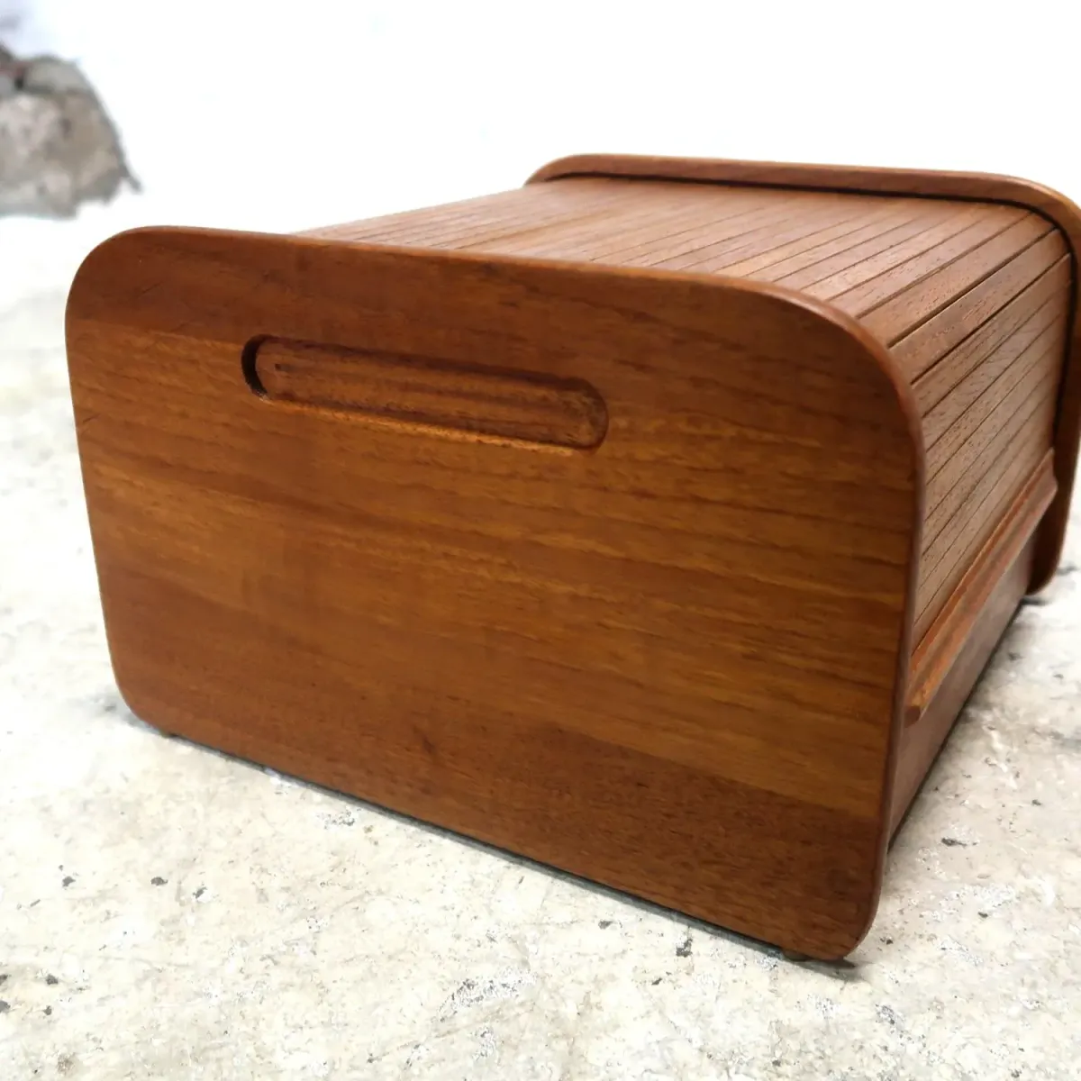 チークウッドを贅沢に使用した作り、ロールトップ(蛇腹)の開閉扉や北欧モノのような角の丸い優しいデザインが魅力的。 美しい自然な木目の温かな雰囲気もGOOD。 画像のようにCDケースがピッタリと収まります。