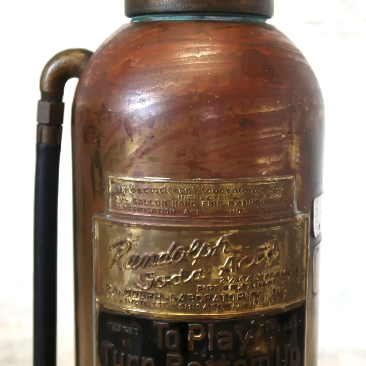 長い時を経た風合い、一目で古いと分かる貫禄の存在感で目を引きます。 鈍く輝く銅製ボディやレタリングビッシリの真鍮のロゴプレート、パーツ類、今には無い重厚なメタルの質感・カラーリングが最高にカッコ良いですね。 今考えるとかなり贅沢な作り、年代の古さが随所に感じられ、オーラのある存在感です。 もちろん使用済みですので消火剤は入っていません。