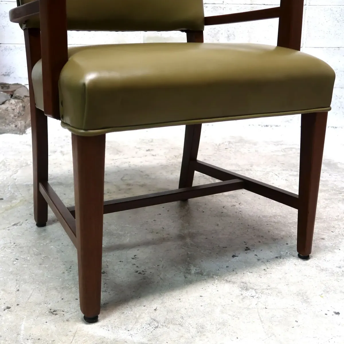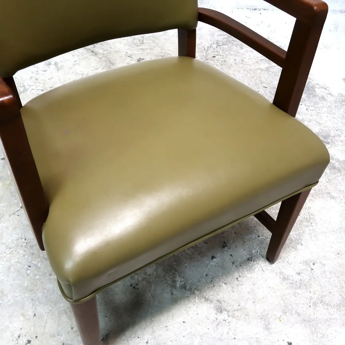 ビニールレザー×ウッドの組み合わせ、レトロモダンを感じさせる落ち着いたグリーンカラーの雰囲気が魅力的。各所拘りの曲線が美しく、今のモノにはない時を経た木目の味わいある表情が目を引きます。 レザー座面もしっかりとした厚みでクッション性があり、まだまだ長く使えそう。デザイン性が高く、抜群の存在感を放っています。 背面スタッズが良いアクセントになっていますね。座って良しなのはもちろん、置くだけでも絵になる素敵なチェアです。