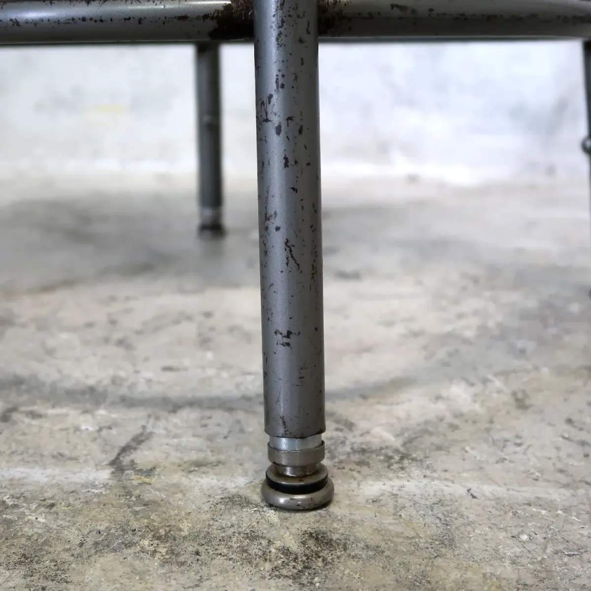 長い間使い込まれた経年の風合いとメタルの無骨な作りが目を引きます。アメリカを感じるUSスタンダードなスタイル、インダストリアルの雰囲気タップリで魅力的ですね。 座面部分はビニールレザーのクッション素材になっています。しっかりとした作りは安定感があり、まだまだ使えそうです。 脚部分で9段階の高さ調節が可能です。
