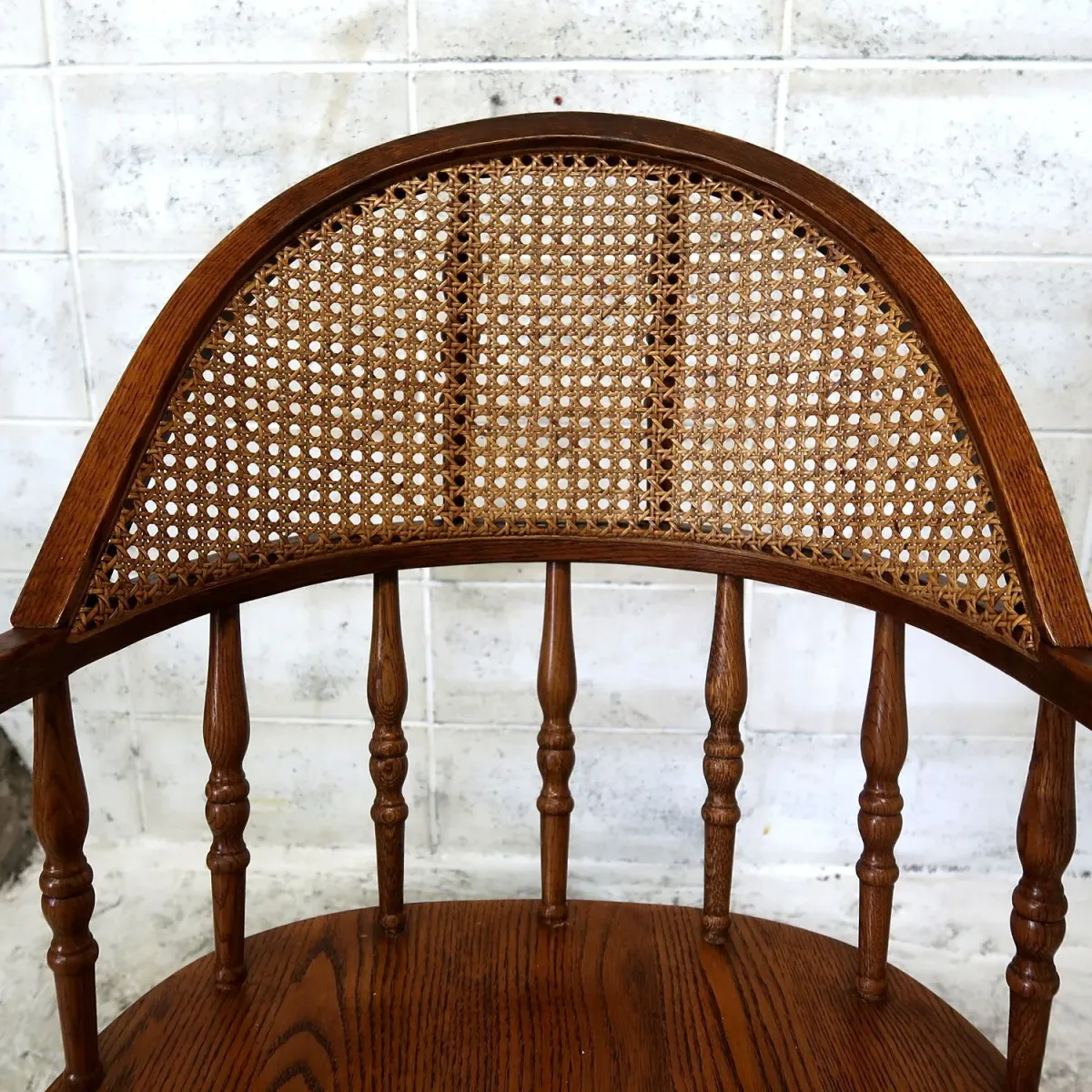 rattan(籐)をメッシュ状に丁寧に編み込んだ背もたれのデザインとオークウッドの丁寧な作り、キャプテンシートと5股脚の重厚感あるクラシックスタイルで拘って作られているのが分かりますね。