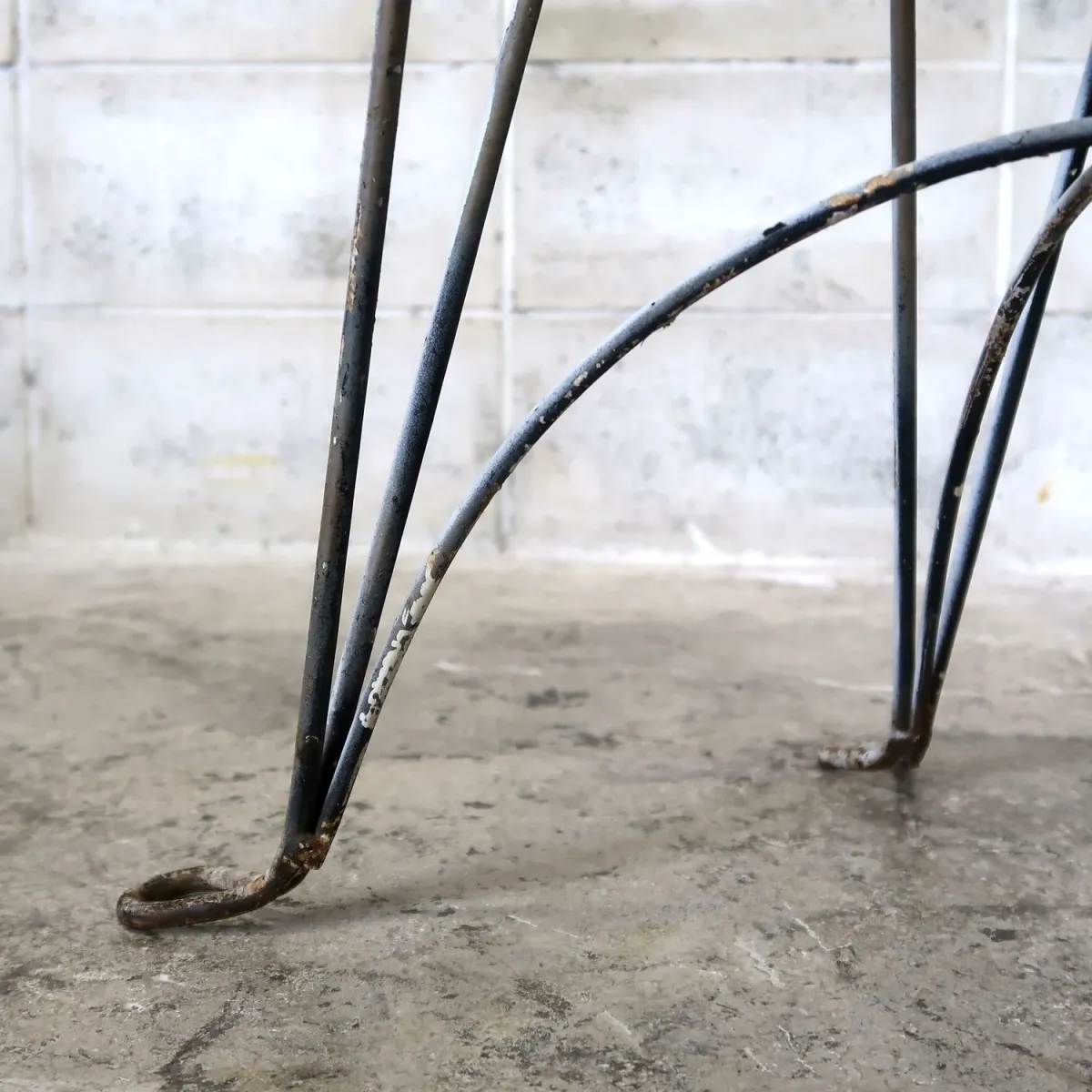 経年によるアイアンのサビや重ね塗りが剥がれたホワイトペイント、時を経た本物にしか出せないシャビーな風合いが絶妙で雰囲気抜群。 ワイヤーデザインならではのシルエットや脚周りの曲げ・丸いメッシュ座面と背もたれが可愛らしく、そこにあるだけで絵になりますね。