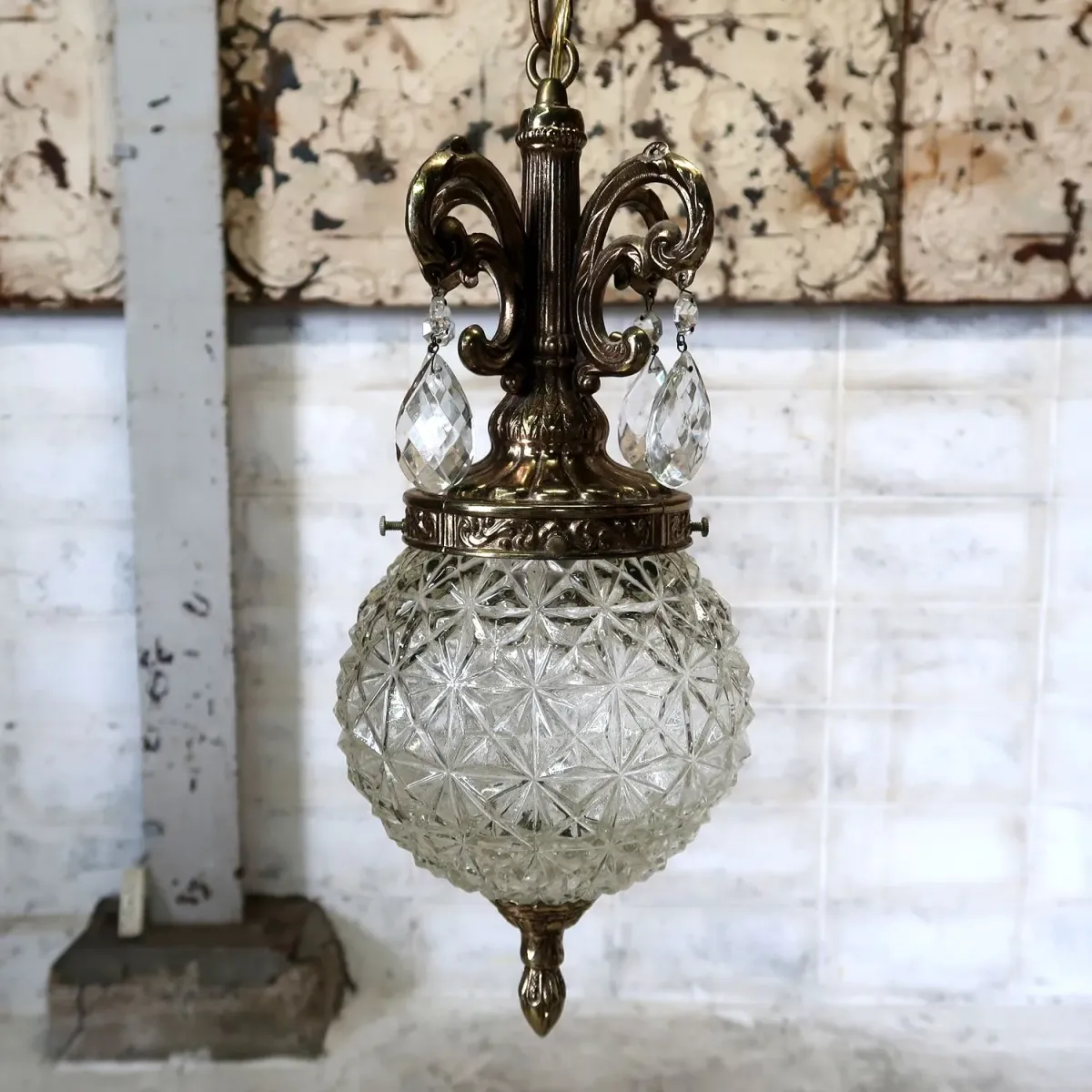 人気の真ん丸フォルムの高級感ある分厚いクリアガラスランプ、ガラスにはカットが入ったような緻密な凸凹の模様、高級感が感じられとても綺麗です。希少なクリスタル飾り付きのOLDな装飾金具もガラスと合っていて良い雰囲気です。全体的なバランスもGOOD。デザイン性も高く、昼間も飾っているだけで絵になります。