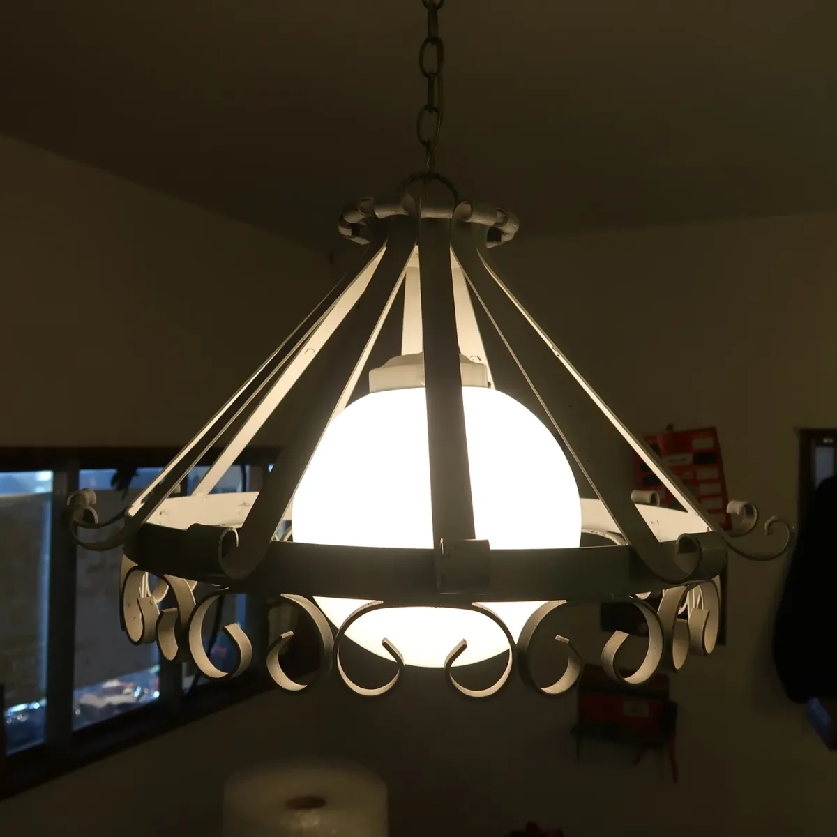 配線はリペア済。電球は日本でも一般的なE-26口径、LED等のeco電球もご使用頂けます。重さが6.6kg程あるのでフック等でしっかりとした取付けが必要です。チェーンの長さは45cm程。短く調節もできますのでお問い合わせ下さい。延長の場合は別途、追加料金が発生致します。シーリングソケットに交換してますので、天井のソケットに簡単に装着できスグに点けることができます。 電球は付属しません。