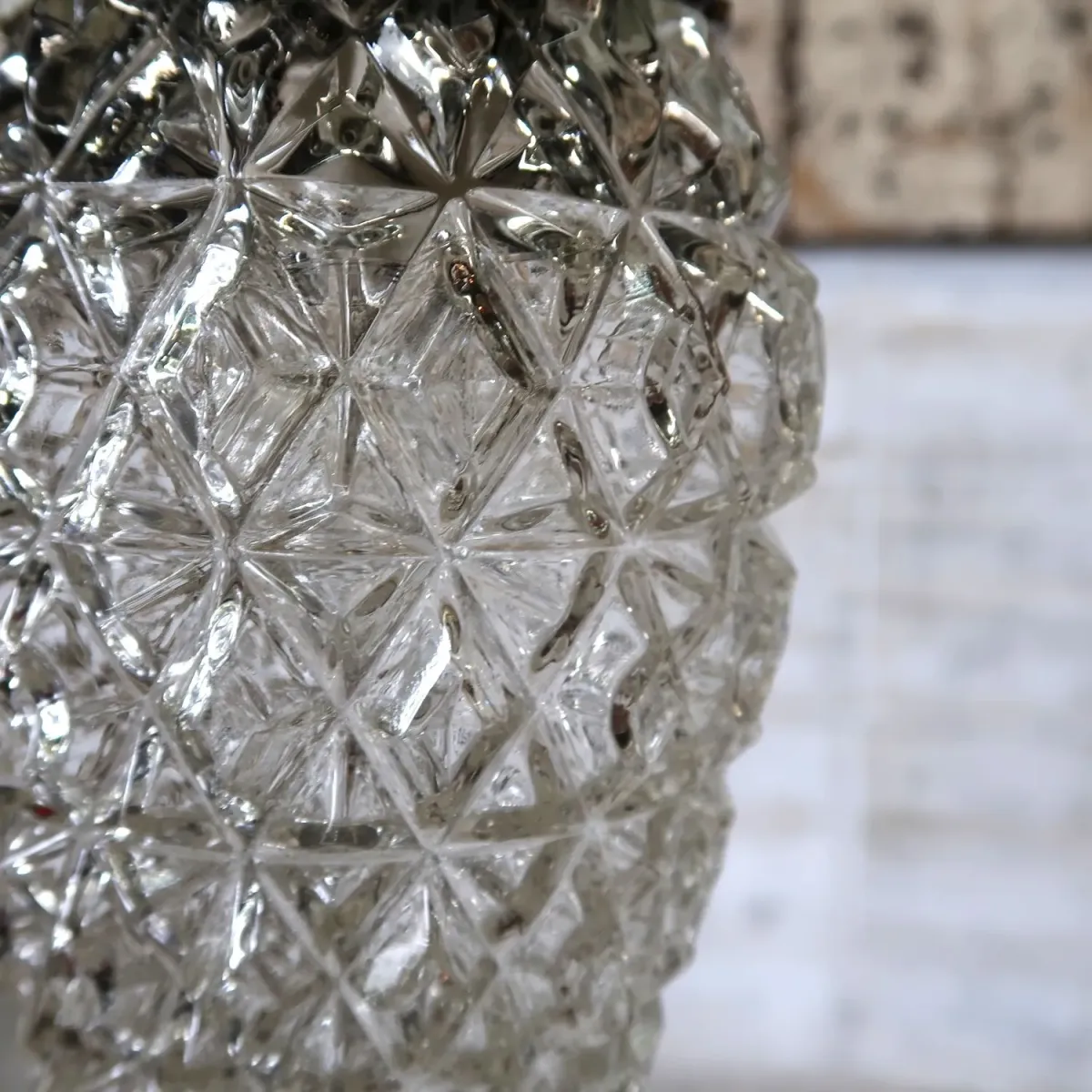 縦長フォルム、比較的コンパクトながら分厚く高級感あるクリアガラス、全面に施された凸凹パターンのカット模様が目を引きますね。