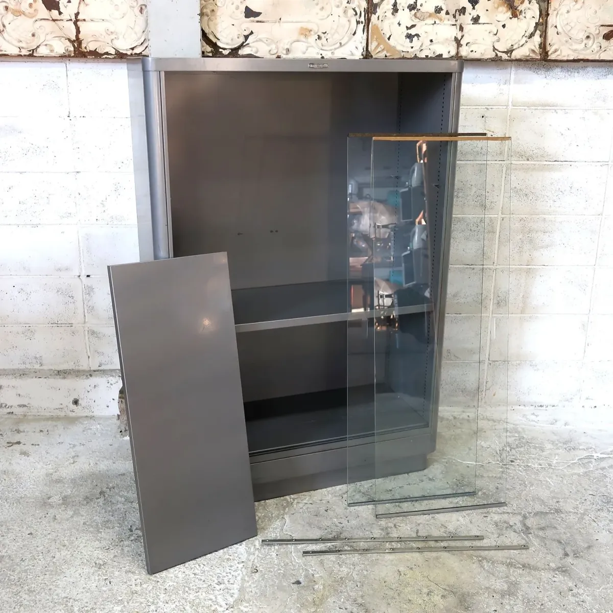 無骨で重厚、存在感のあるインダストリアルデザイン、何より雰囲気が良いですね。クリアガラスのガラス戸、探すと意外と見つからないスライドドアタイプです。前面上部のロゴタグもカッコ良いですね。 空間創りの一つのインテリアとして、そこにあるだけで絵になるスペシャルビンテージアイテムです。