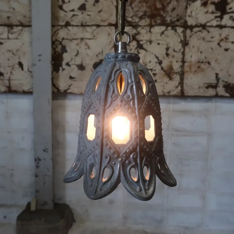 目を引く無骨で小ぶりなワイヤーメタルのデザイン、普通のランプには無い独特のオーラが感じられます。ソケット部はホーローと真鍮で出来ていて、ゴールドとホワイトカラーのコントラストが良いアクセントになっています。 シェードの底面が開く仕様もカッコ良く、天井に映る陰影もこのデザインならではですね。OLDでインダストリアルな雰囲気が感じられて良いでしょう。