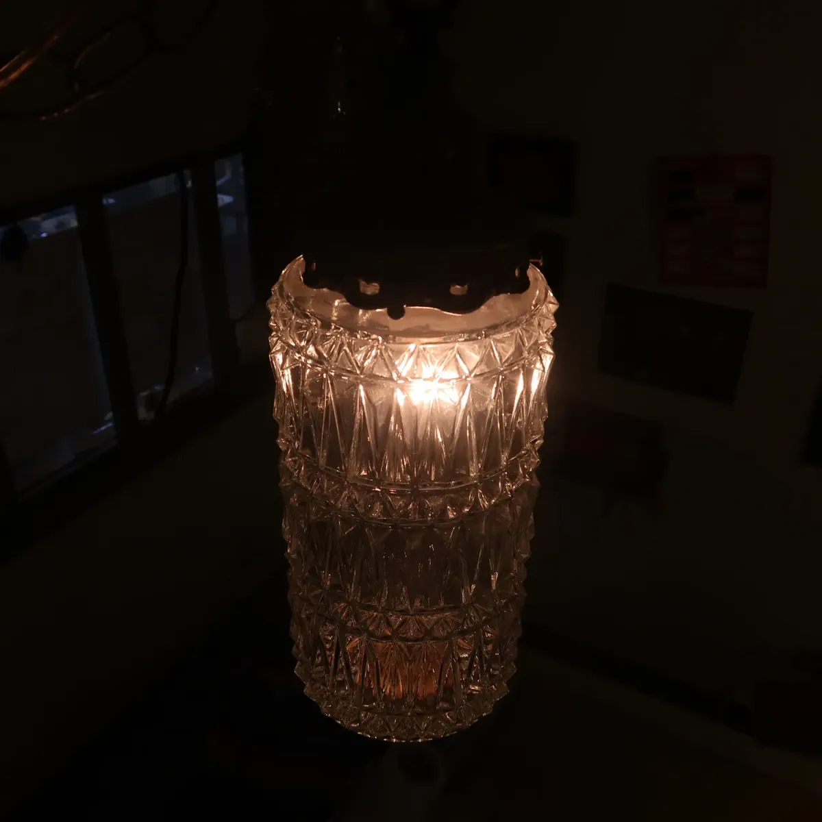 重厚なガラスにはカットが入ったような緻密な凸凹の模様、高級感が感じられとても綺麗です。灯りを点けると凸凹面に光が反射し、キラキラと優しく美しい輝きが広がります。