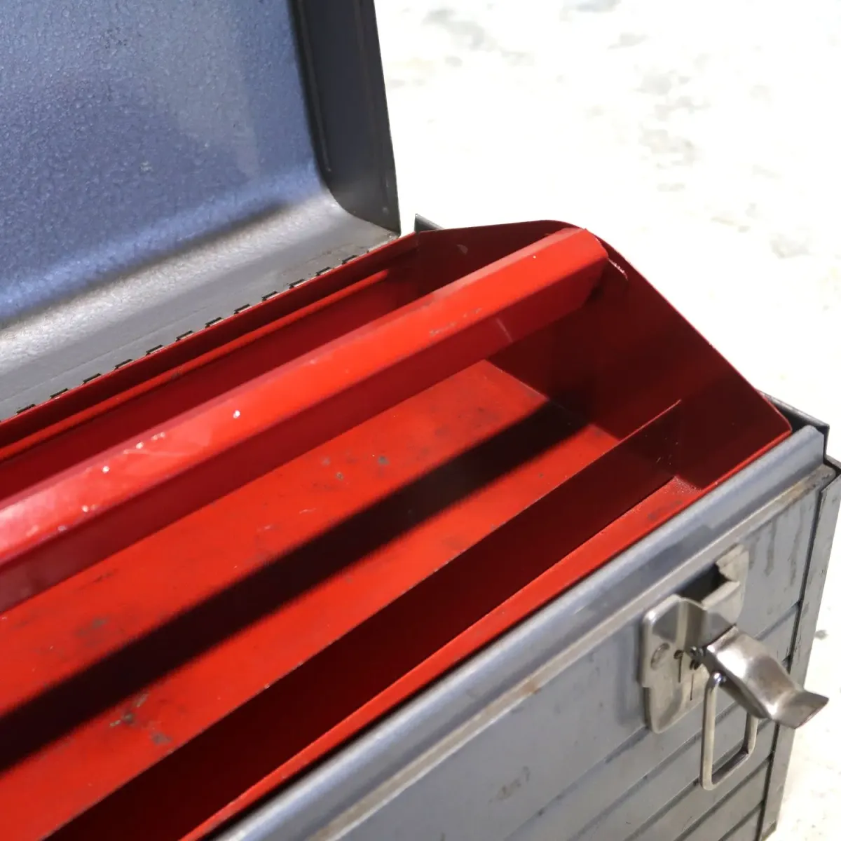 長年使い込まれてきたキズやサビ、メタルの風合いが歴史を感じさせてくれます。スクエアフォルムの重厚な作り、無骨な各所の金具やハンドル、OLDなロゴプレートもカッコ良いですね。 内部は取り外し式のトレイ付きで2段構造になっているので、効率良く収納できるでしょう。