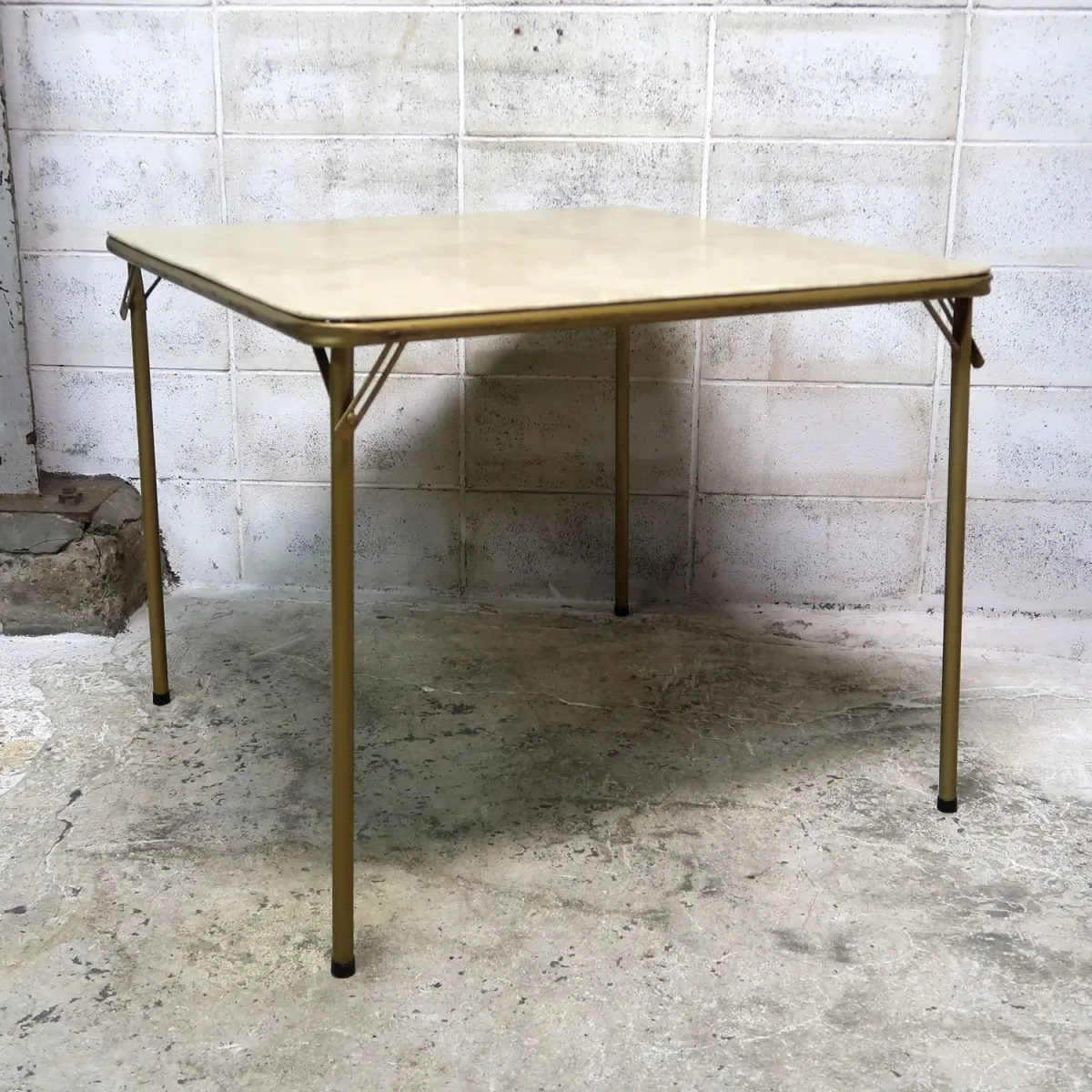 レトロな模様が入ったビニールレザー張りの天板、ゴールドカラーのメタルフレーム・脚の組み合わせが目を引きます。簡易テーブルならではのシンプルさが良い味となり、古き良き時代のアメリカの空気感がよみがえります。4本の脚はワンタッチで折り畳めるので、移動や収納も楽々ですよ。