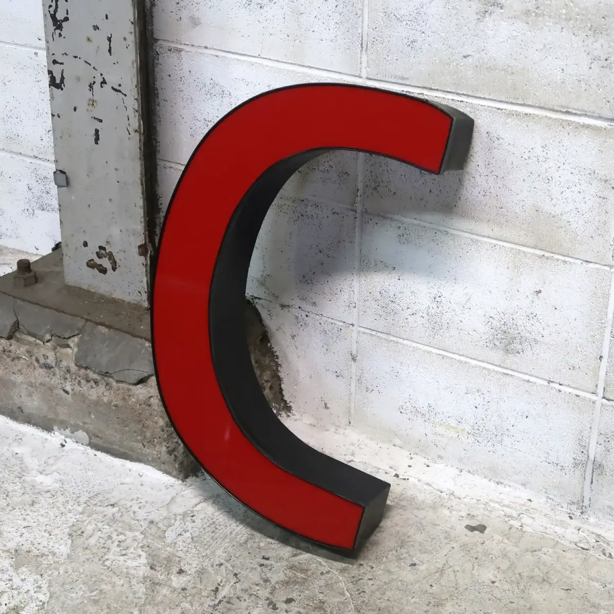 メタルベースにプラスチックのカバーが付いたデザイン。レッドとブラックのコントラストが目を引きますね。大きいサイズ感、独特なフォントデザインもNICE。 元は照明具が入っていたチャンネルサインで、その為に深さがある作りとなっています。 電球をいくつか仕込んで光らせるのもオススメです。