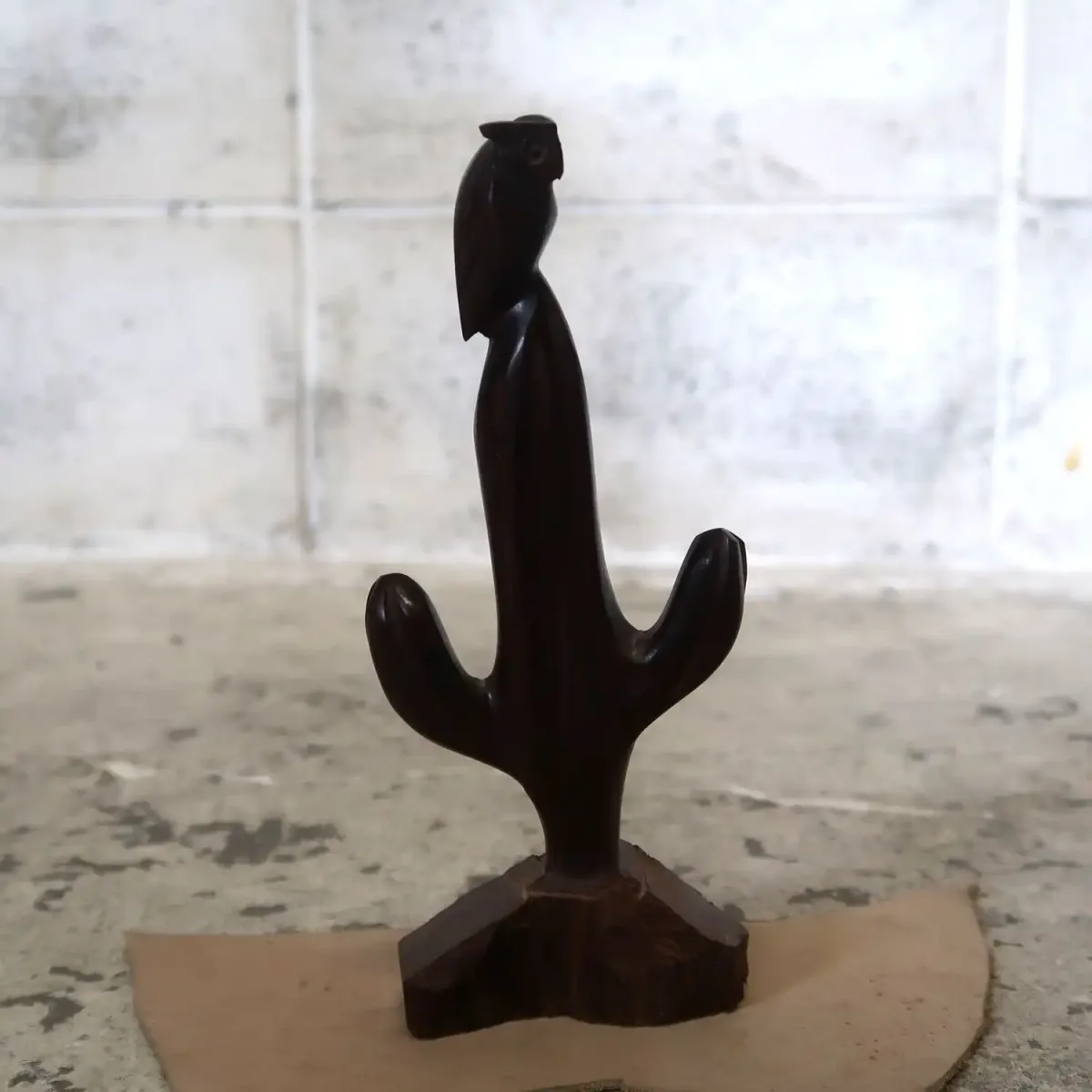 人気のサボテンモチーフに乗ったフクロウ、それを見上げるコヨーテが可愛らしく目を引きます。 高級木材であるローズウッド特有の木目や重厚で滑らかな質感が綺麗で魅力的。無垢材から削り出し磨いて丁寧に作られているのがわかります。