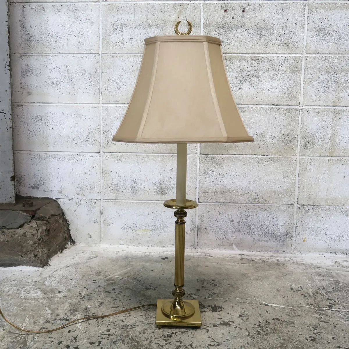 キラリと輝くGOLDメタル、上品でスッキリとしたデザインでスマートな立ち姿が目を引きます。ローレルリースの装飾やシェード下のキャンドルスタンドを模したデザインも魅力的。OLDなシェードの透け具合が綺麗で優しい温かなムードを創ってくれます。お部屋の雰囲気をガラッと変えてくれる印象的なランプです。