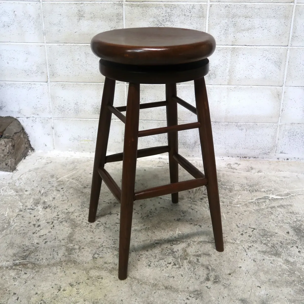 長い時を経たウッドの味のある風合い、特徴的な木目の温かみ、しっかりとした作りが魅力的です。重厚感がありながら無駄を削ぎ落とした洗練されたデザインに拘りを感じますね。空間創りの一つのインテリアとしてそこにあるだけで絵になる存在感です。座面は回転式。回転式は座り降りがしやすいのも嬉しいポイントですね。