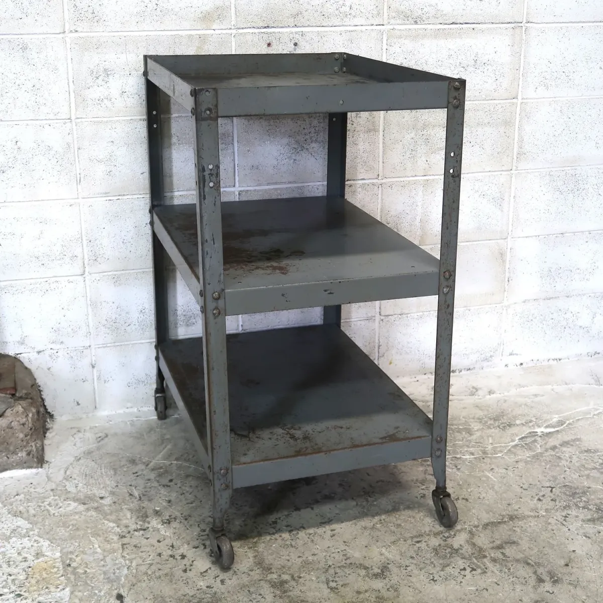 使い込まれたメタルの経年の風合い、質感が最高にCOOL、ワーク仕様の重厚で無骨な作りがカッコ良く目を引きます。古き良きアメリカを感じるリアルな存在感です。 ズッシリと重量感がありますが、キャスターが付いているので移動が楽なのも嬉しいポイントですね。棚板の間隔はそれぞれ31.5cm程です。