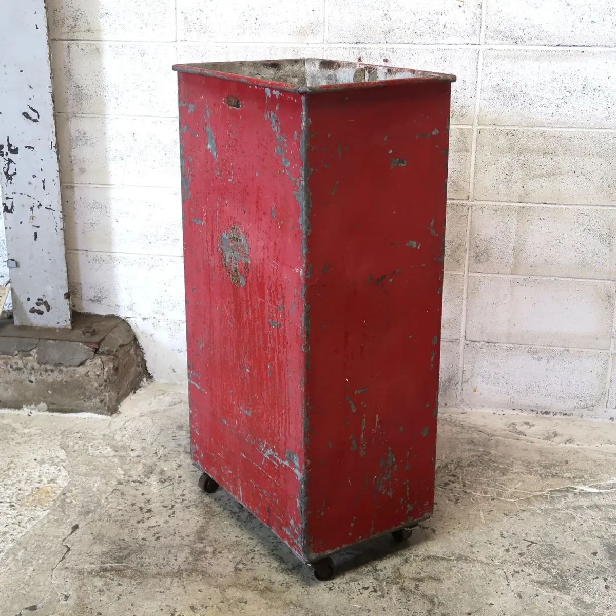 質実剛健な長方形の無骨なデザイン、時を経たシャビーな風合いが最高にCOOLです。上部のタグが良い雰囲気、剥がれたラベルもビンテージらしい貫禄のオーラがありますね。 重厚な作りはズッシリと重みがありますが、キャスターが付いているので移動も楽々です。