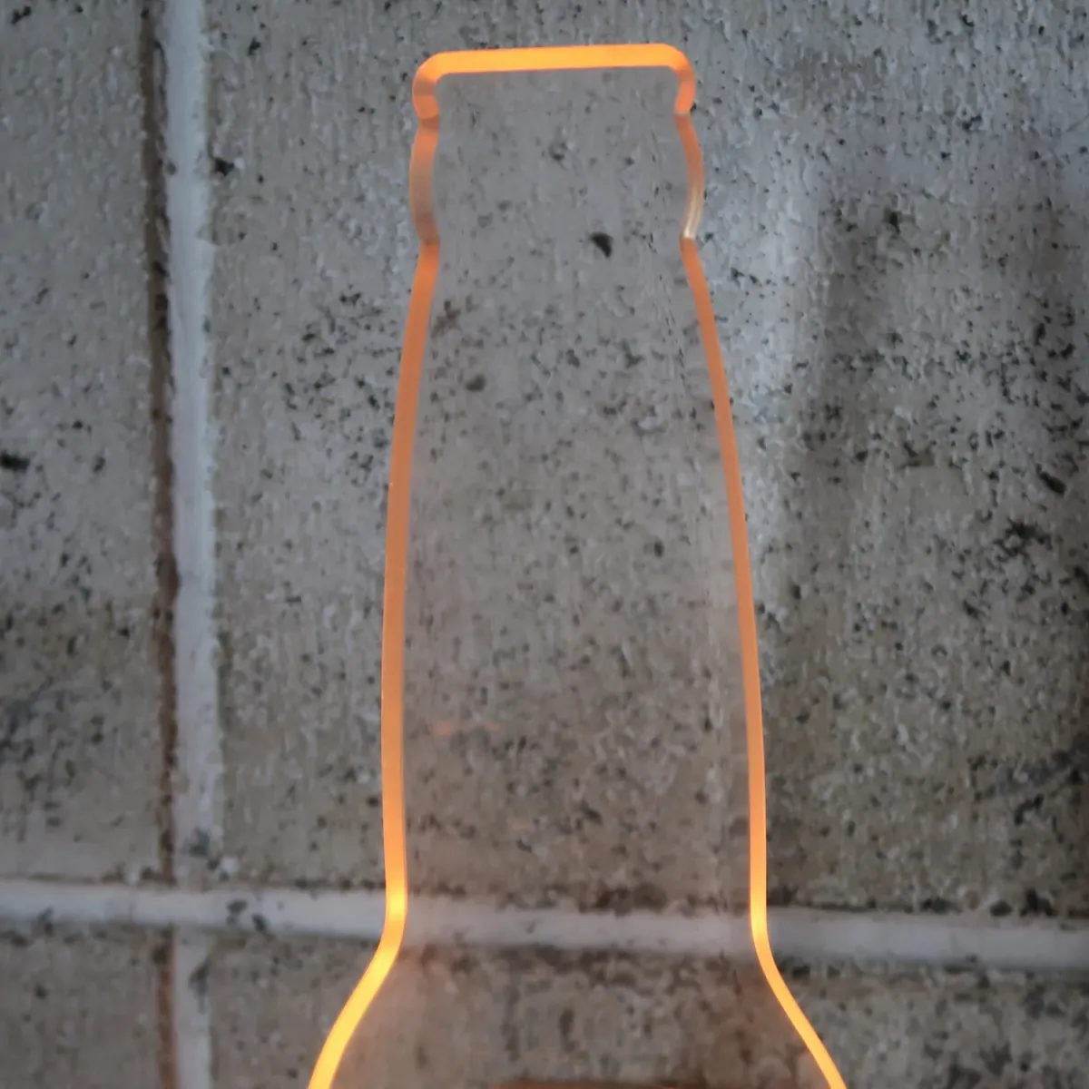 ボトル型アクリルを通して縁が光るような、個性的な作りが目を引きます。日本でもお馴染みのラベルロゴもインパクト抜群。 昼間はウォールサインとして、夜間は少し暗い場所で光らせると存在感が増しますよ。